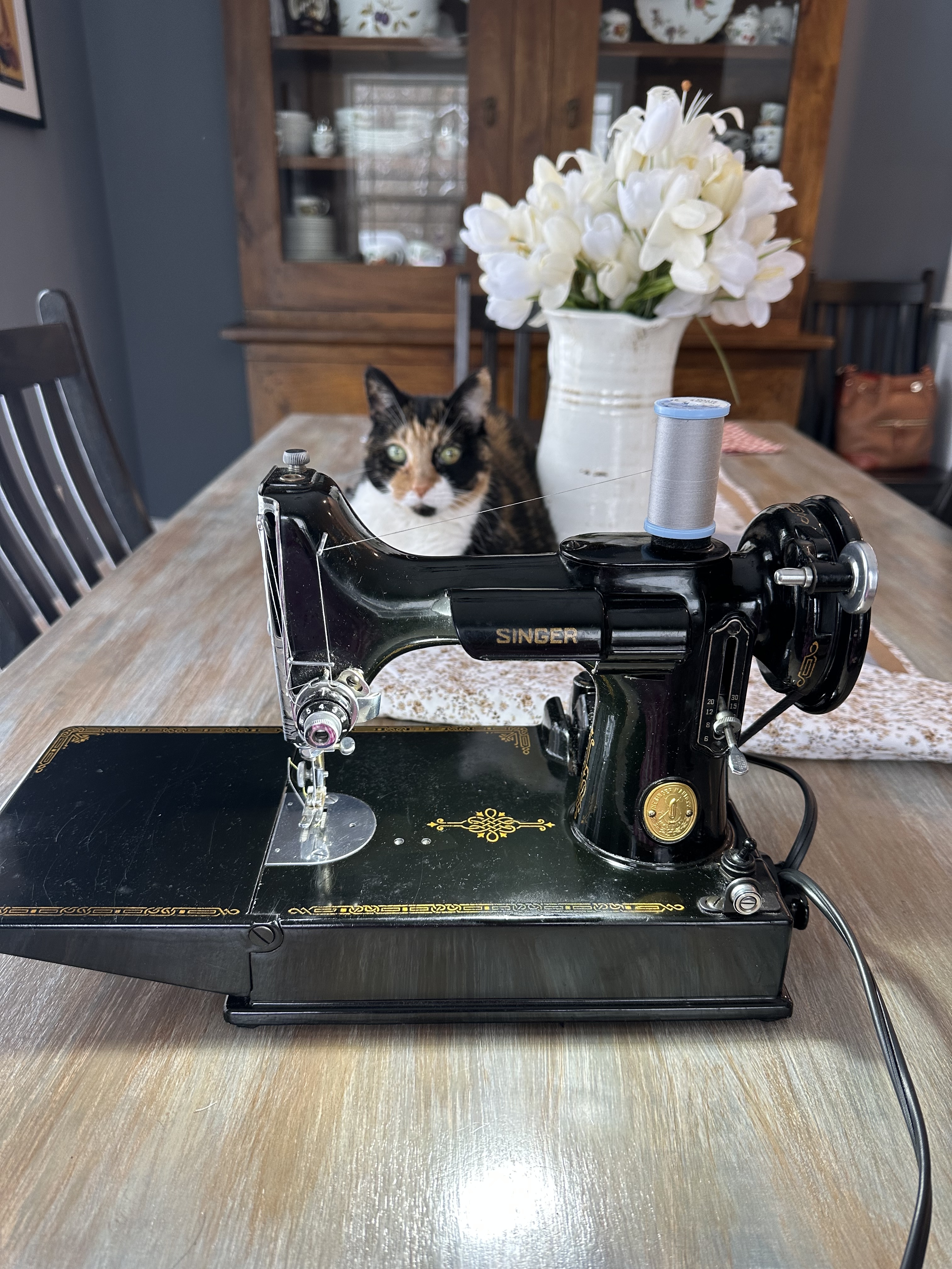 We are in Michigan and it’s been another cold, sometimes snowy week. I was excited to have very little planned for the week so I could focus on interior home projects. I finished a table runner (sort of visible in the background of the pic; my sewing supervisor is laying atop), matching napkins and was able to play a bit with this 1941 Singer Featherweight machine. I am amazed at the workmanship of this sewing machine…so much sturdier than my newer sewing machines (which have plastic exteriors). As newer items (mainly kitchen electronics) break, I am trying to be thoughtful as to whether to replace. Convenience is just that, it’s not necessarily better.