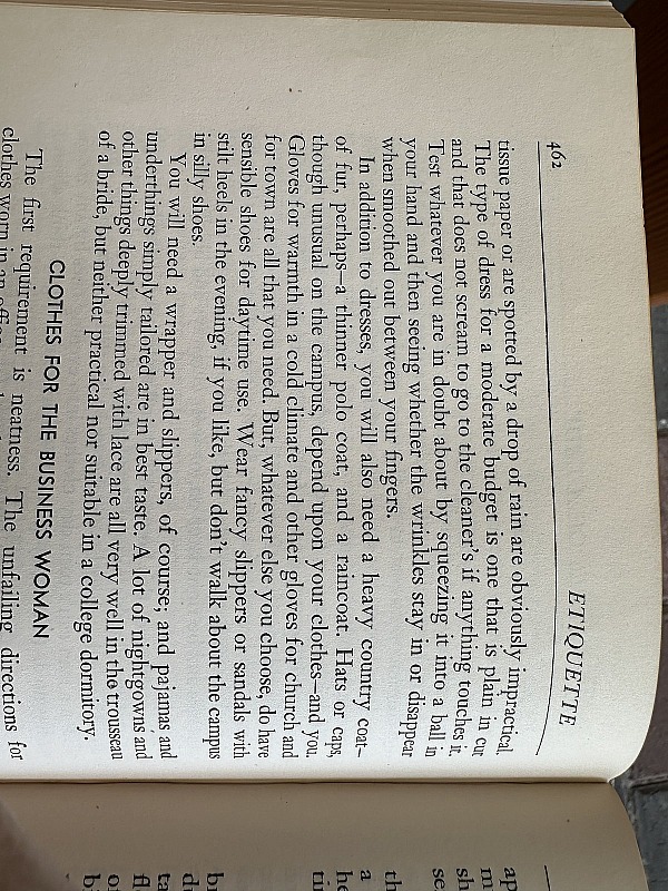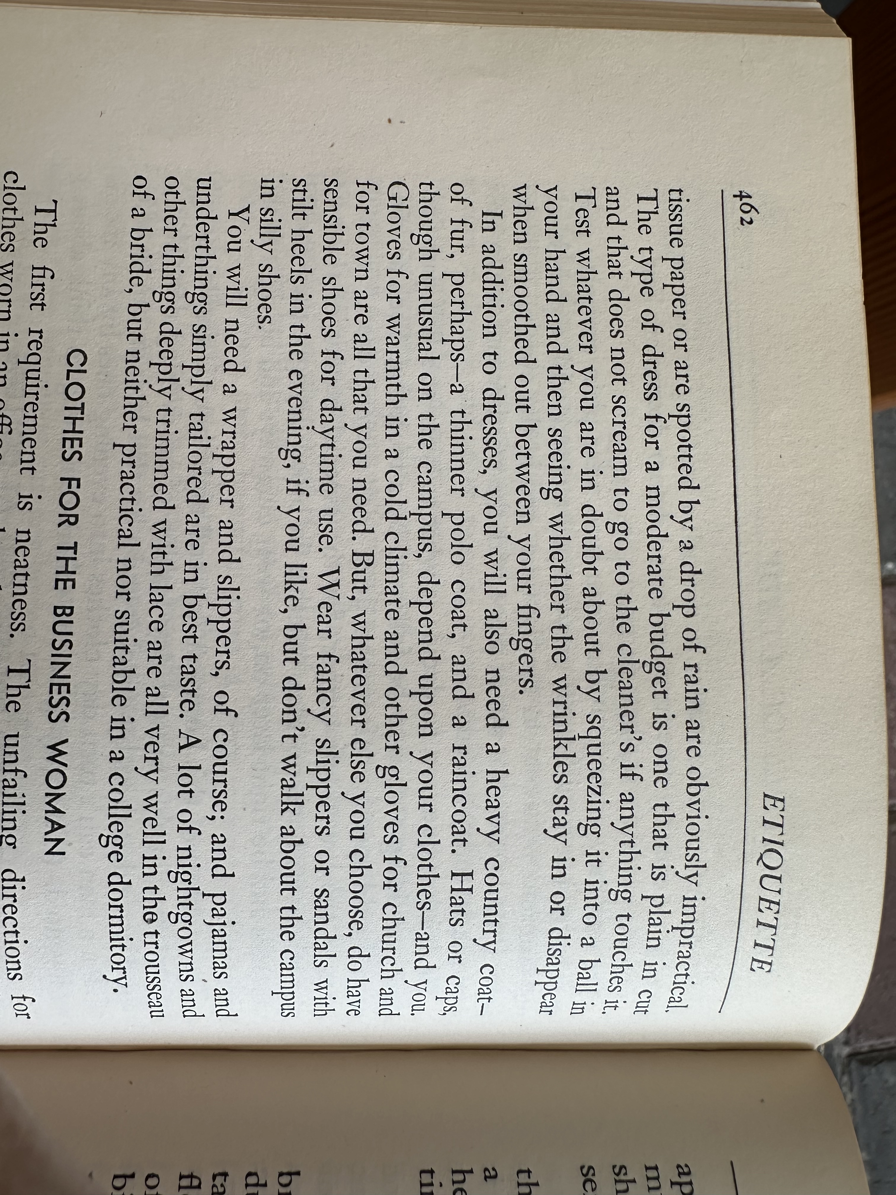 I won’t retype all of my original comment but I also wanted to attach this from the Emily Post 1945 edition of her etiquette book. This is for a young woman to go to college.