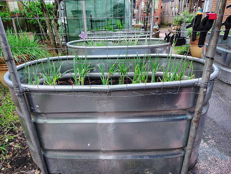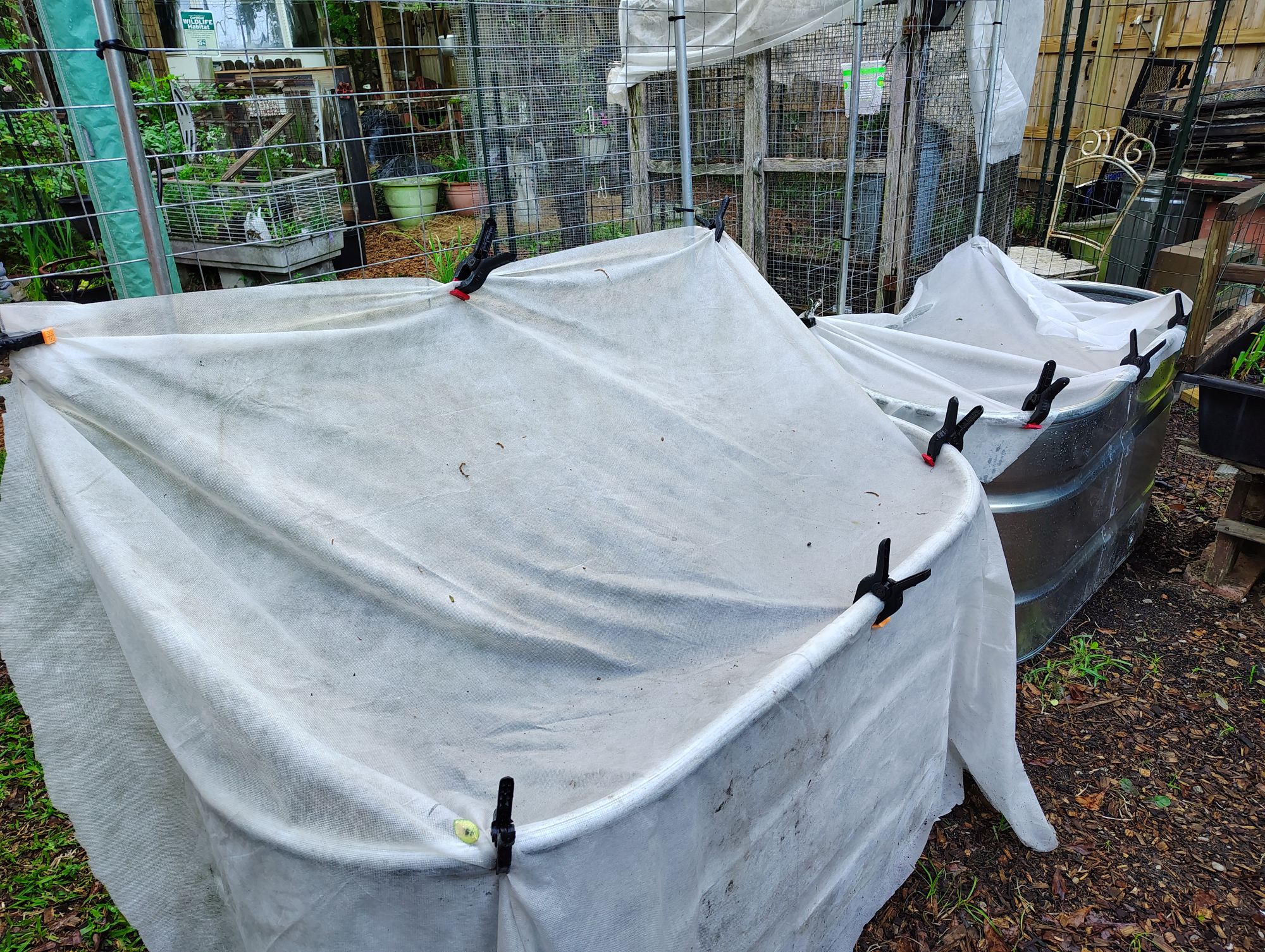 I bought shade cloth to put over the top for when it starts getting too hot for the plants. I also bought frost/shade cloth to use when needed. For a quick temporary fix we clamp anything we can grab to cover the tanks if there is a quick thunderstorm with hail as of twice this week. Also for a heavy rain because I don't want the seeds to float away. We have been having more storms with hail the past couple of years now and we frequently get high wind storms as well so this is what we have done to protect our garden so we can hopefully get a better harvest.