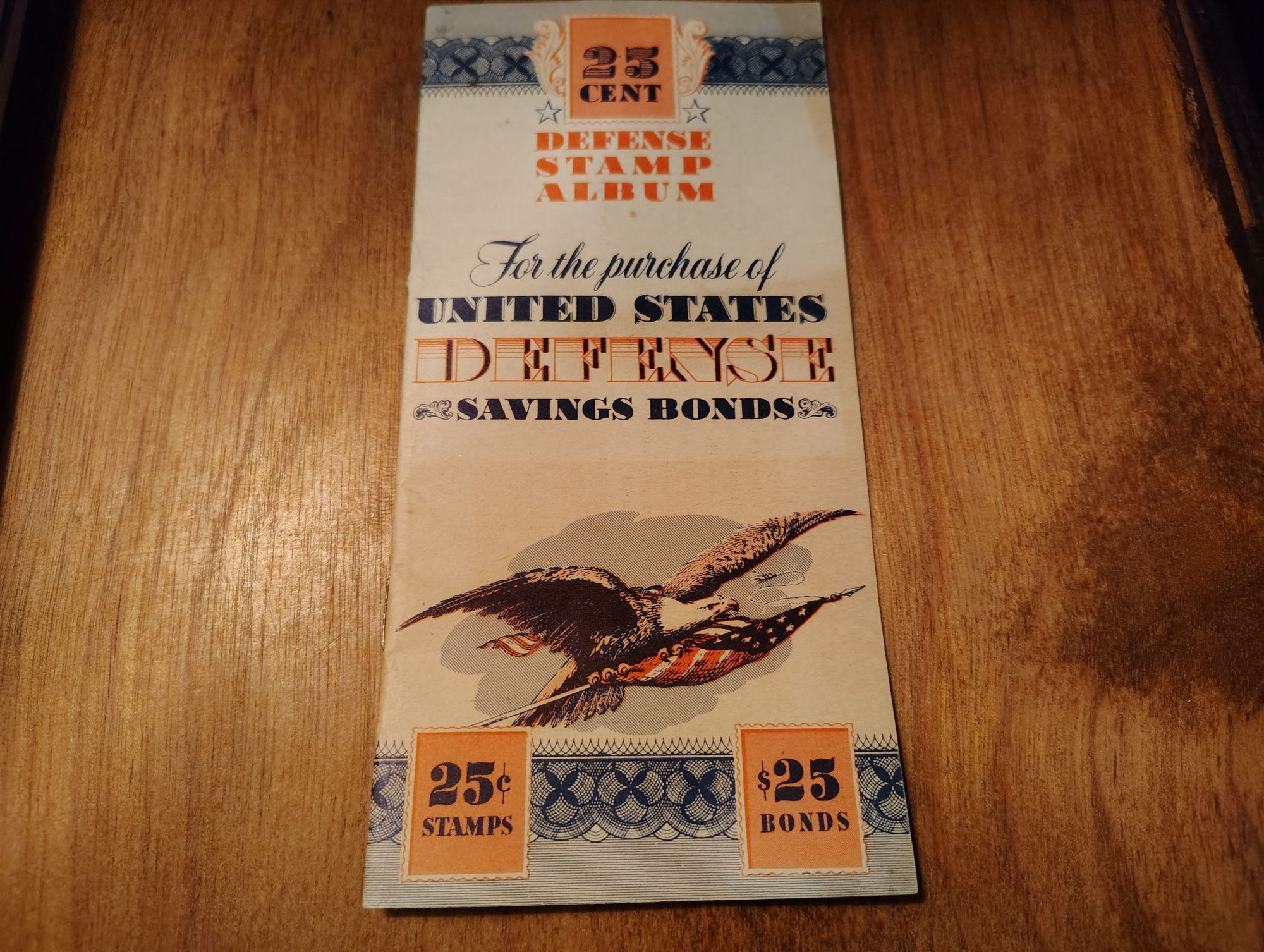 This says above, This is Your Twenty-five Cent Defense Stamps and it will have a value of $18.75.  Exchange it at the post office for a Defense Savings Bond which, after 10 years, will be worth $25.00.  Then start filling another Defense Stamp Album.  Defense Stamps are sold in Five denominations, 10c, 25c, $1, and $5.   With your first purchase of any Defense Stamps, you are entitled to receive an Album for mounting that kind of Stamp.  Mount none but 25c, Defense Stamps in the Album.   Be sure to affix Stamps securely.  As you fill this Album with Defense Stamps it will rapidly grow in value and should be guarded against theft of loss.   A precaution is to carry your Album in a self-addressed stamped envelope with a written request on the envelope to return to you if found.