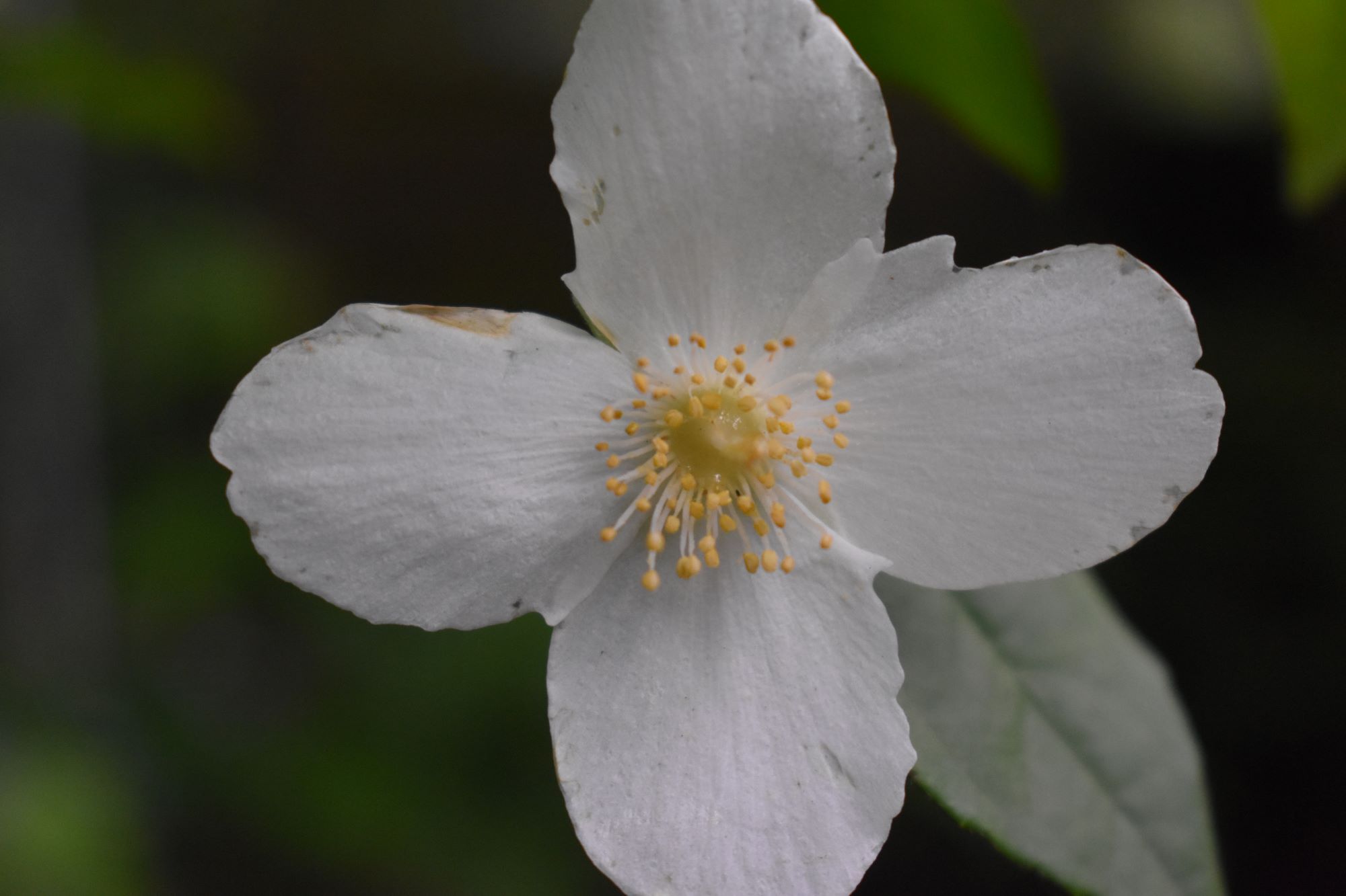 Don't focus on the flaw on the bloom but the shape of the petals and the details in the center of the bloom. Learn if this is a self pollinating bloom or does it need a pollinator? This is a English Dogwood tree bloom, it contains both male and female parts, stamens, and pistils, but it also benefits by cross pollination from insects.