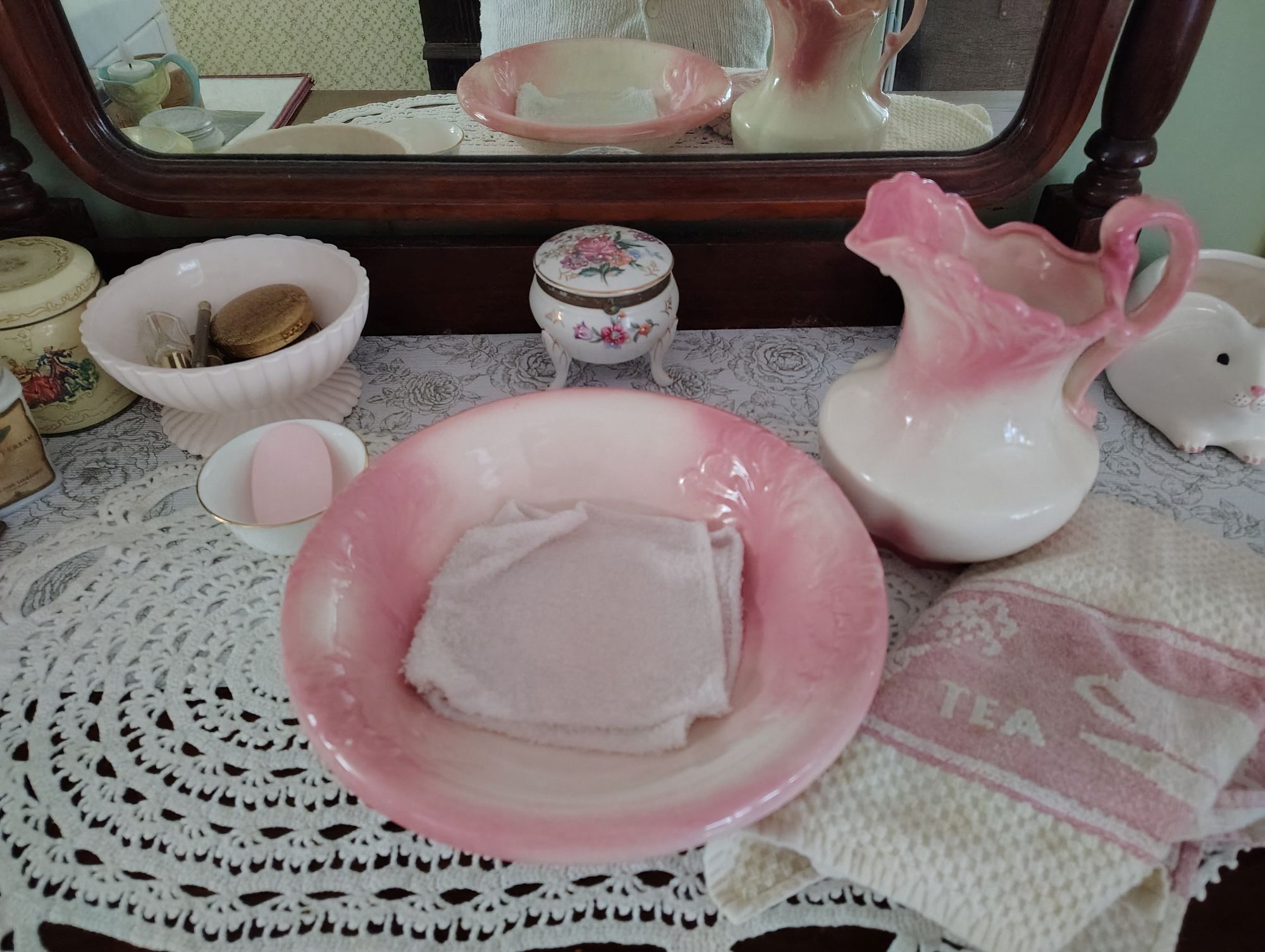 My daughter found a lovely small pitcher and basin while thrifting and brought it to me when she came up for the visit. I am using it for morning wash up as a face bowl. It is very handy and feels a bit DejaVu or somehow like it is supposed to be.