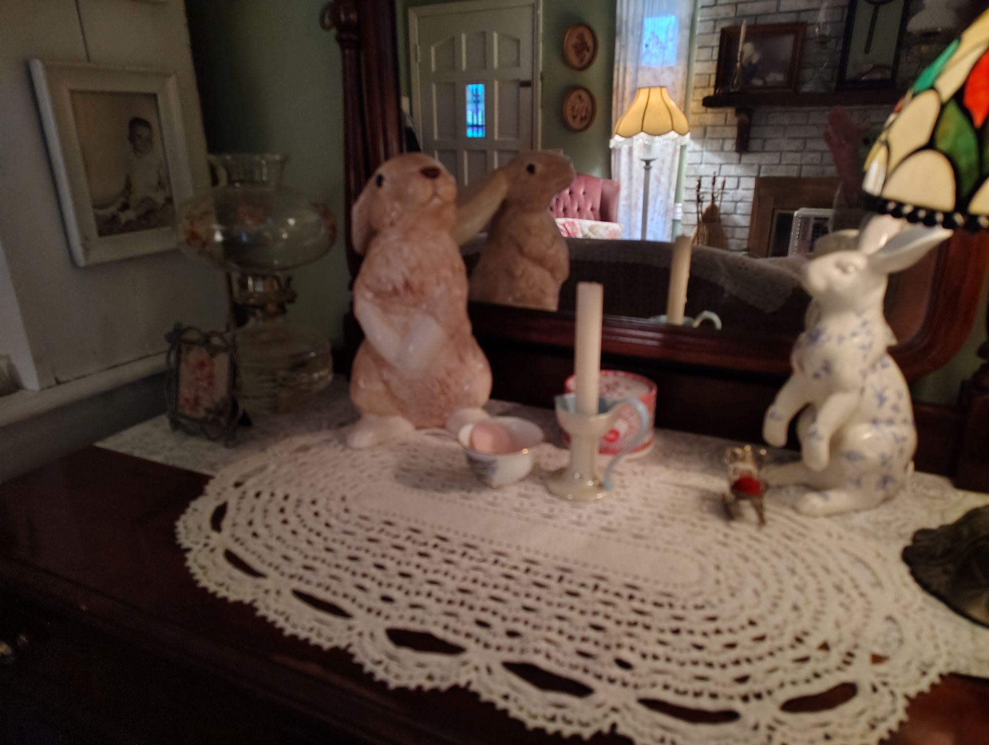 Ellie and Pergie once again changed their location. Today they are in the living room on the bedroom dresser. Yes, the bedroom dresser is in the living room now.