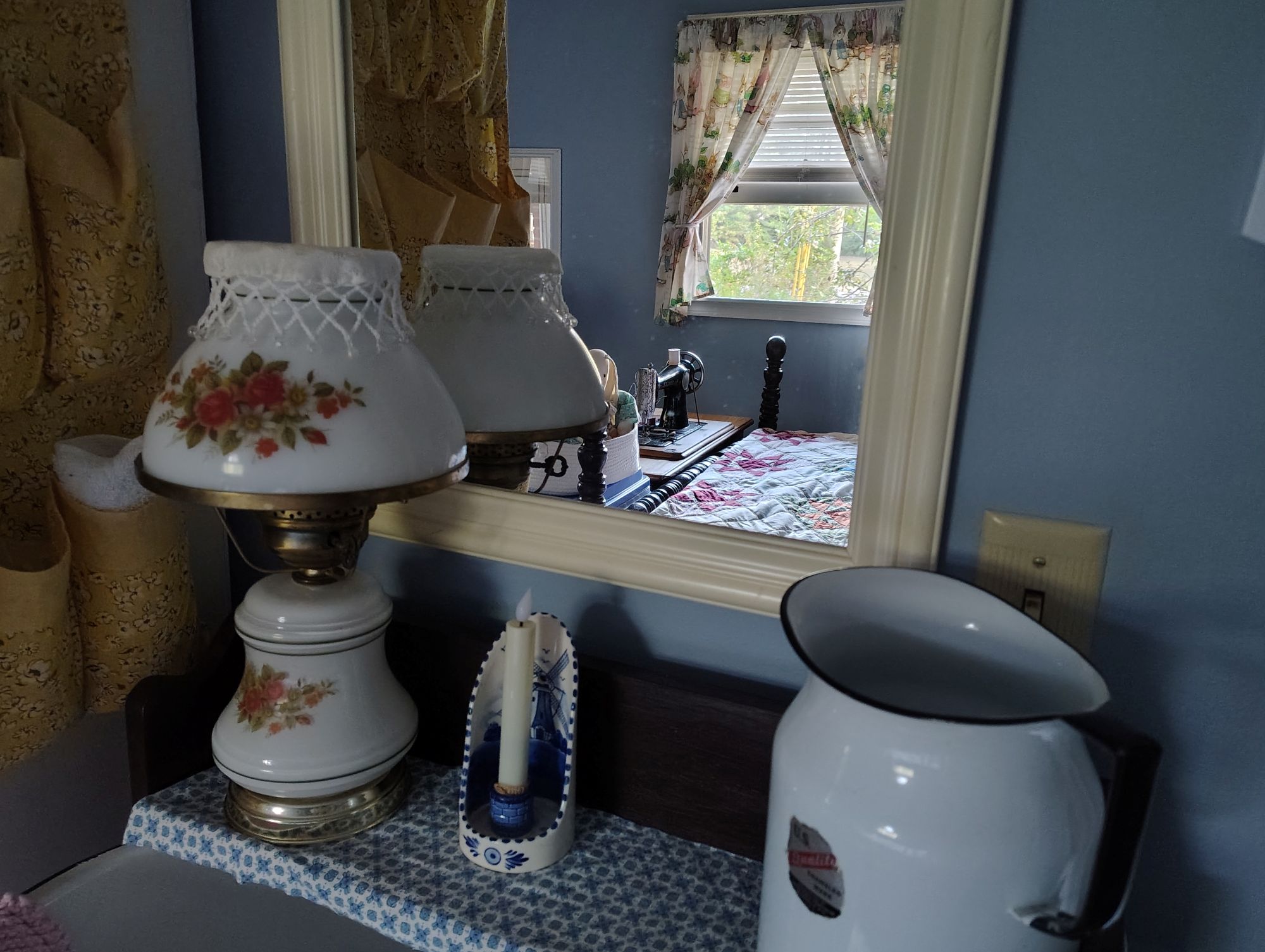 You can tell the bunnies are worried, they wonder if they are going to move again. Actually I have decided to give them their own shelf in this bedroom so that they can stretch out a bit. I do not consider them clutter, they are part of the family so they can stay.