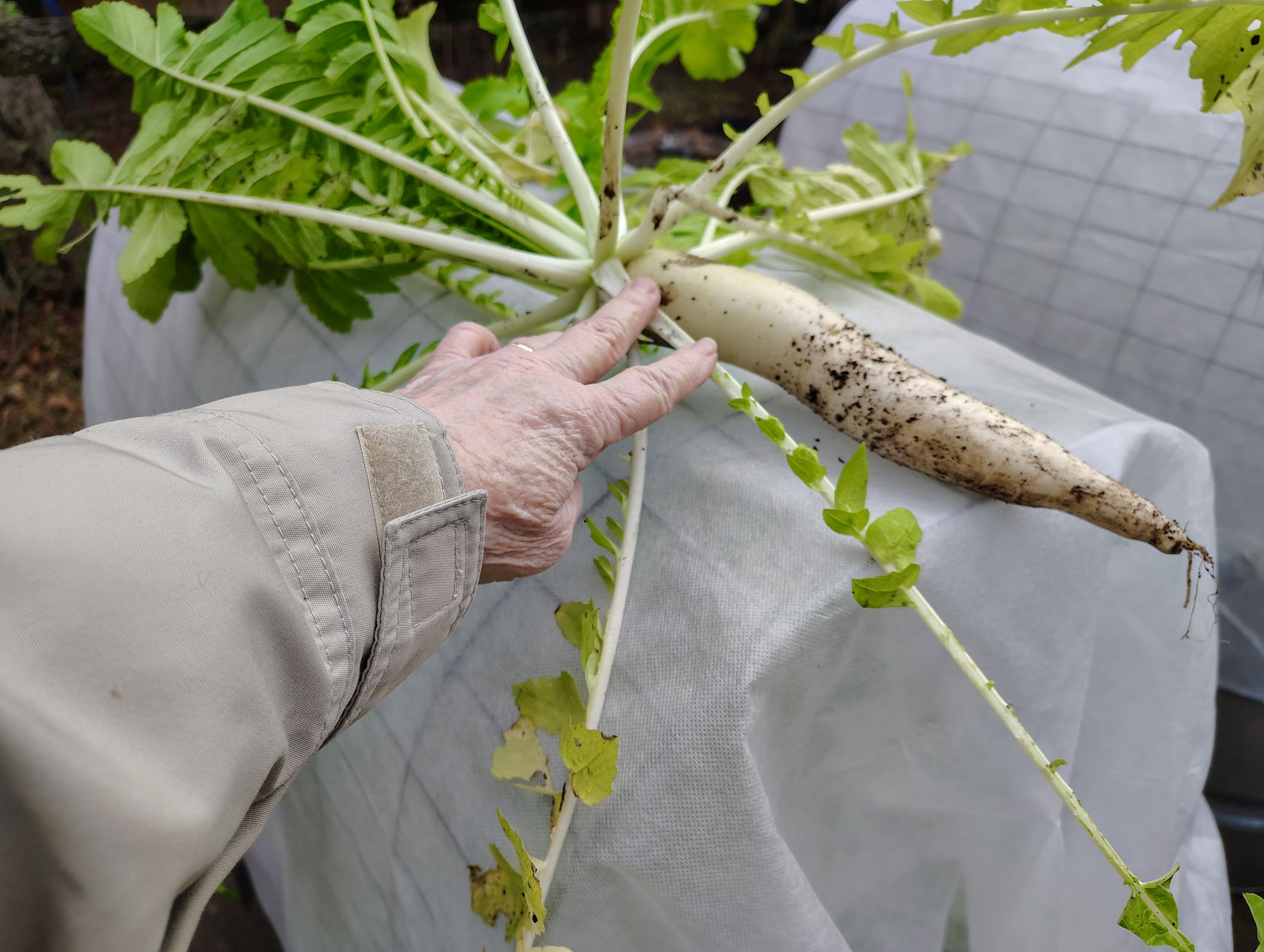 We pulled a radish for our supper, I love the taste of daikon radish and the nice big size of them adds a lot to the meal. The daikon radish leaves are edible.