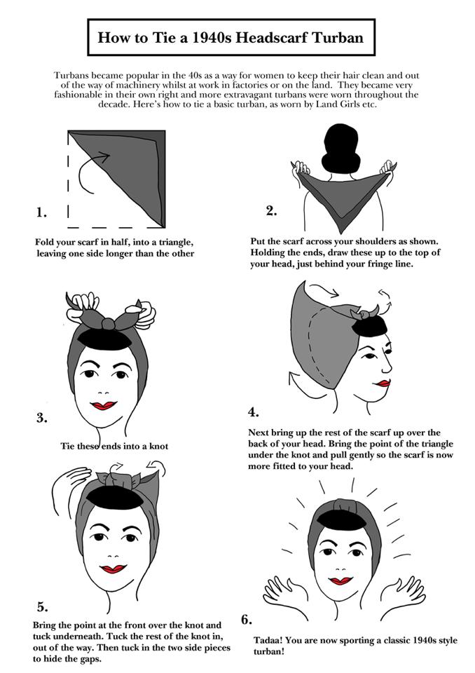Speaking of working women in the 1940's. . . Do you (or does anyone reading this) know how to tie your hair up in a scarf with a little knot in front, like Rosie the Riveter? I've seen photos of my great-grandmother and one of my great-grandfather's sisters wearing their hair like that, and was trying to do it, but couldn't even figure out what size and shape of scarf to start with, or what the first step would be. If anyone knows, instructions would be greatly appreciated:)