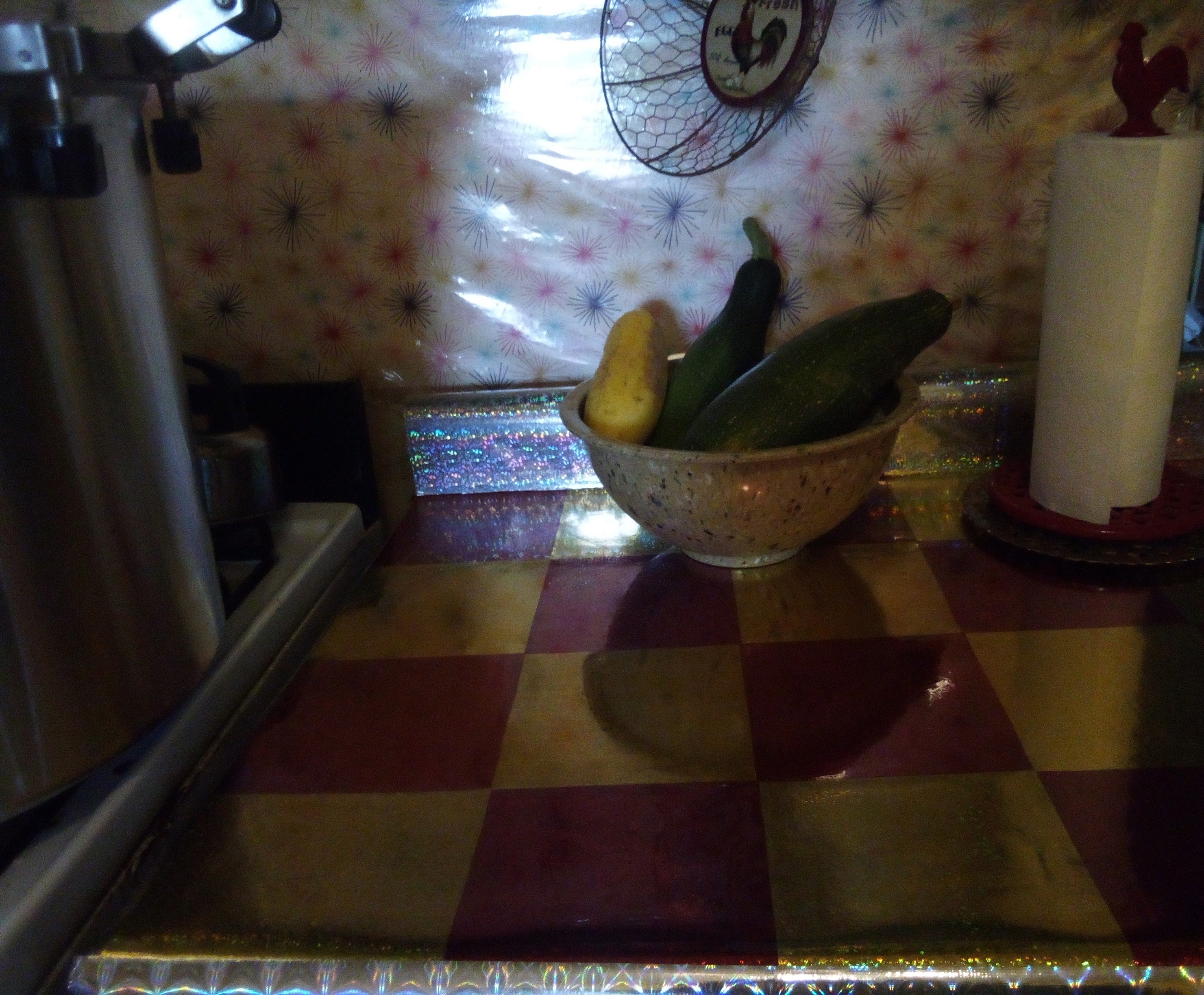 I was able to get a few things done, too. I really wanted to do something with my countertops for a long time. I finally got it started. I only have one counter to go. I had very little money to spend on the project, so in the 1930s mindset, I made do. Most of the materials I used for it came from Dollar Tree. I like a lot of color in my kitchen, so when I saw these items at Dollar Tree, I knew I had to use them in my kitchen. It looks much better in person than the pictures show. I like it anyhow, and I'm the only person who lives here, so I guess that's all that counts.