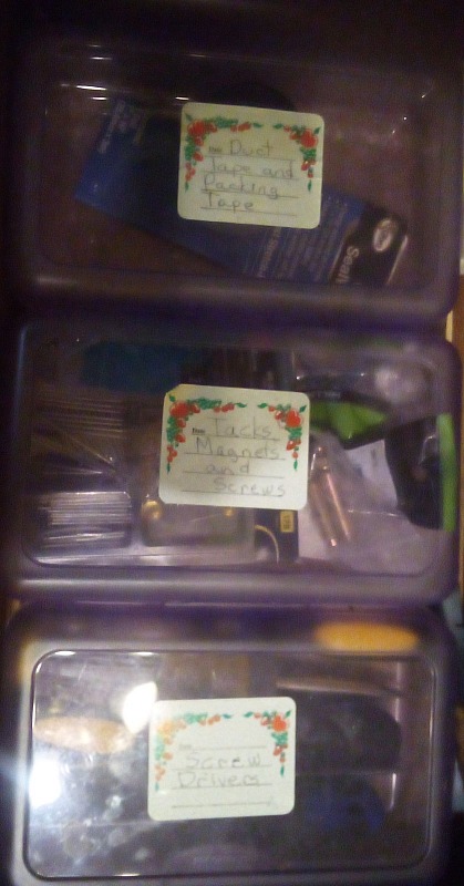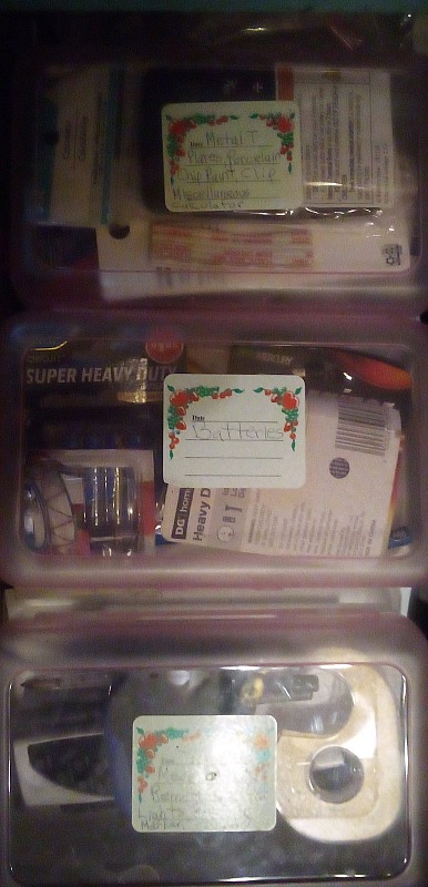 I have a hanging shelf by the basement door that I organized a few years ago to hold all that stuff that usually ends up in a junk drawer. I used plastic cups and little storage containers from Dollar Tree. It's helped immensely. I probably should sort through it and see if I need to purge anything.