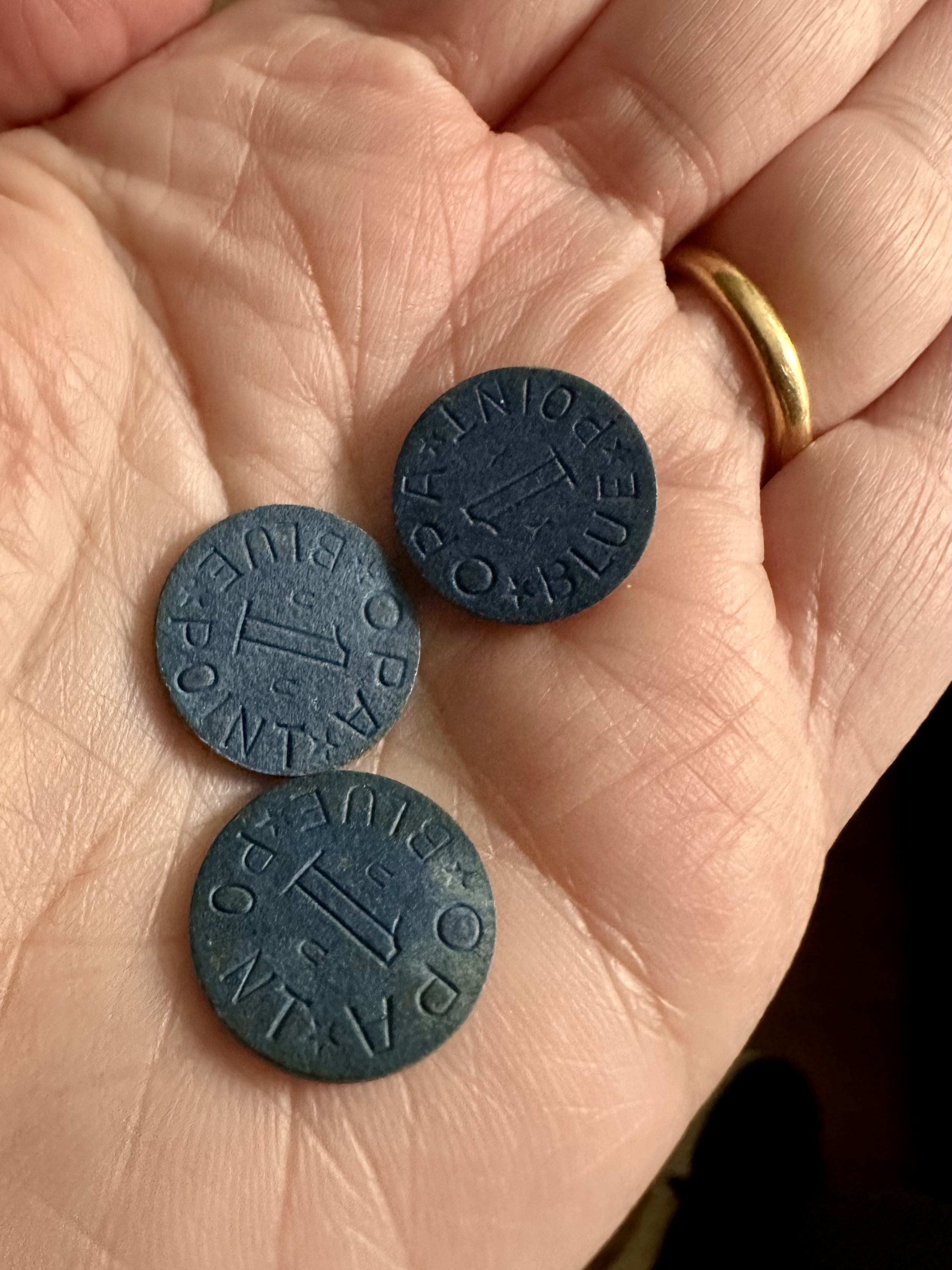 I have 3 of the little ration “coins” that were given as change for the blue ration stamps. These came from my grandmother’s jewelry box. She was in her late 30s during WW2. Unfortunately she died when I was a teenager, before I was interested in her history, so I don’t have her stories. She was introverted and didn’t really ever talk about herself. My other grandmother was about 13 when the United States entered the war after Pearl Harbor, so she did have some stories to share. She knit bandages, which put her off knitting for the rest of her life. Her family did have a victory garden and her aunt planted food everywhere she could find a few inches of dirt, including planting onions along the side of the garage in a bed only 8 inches across.