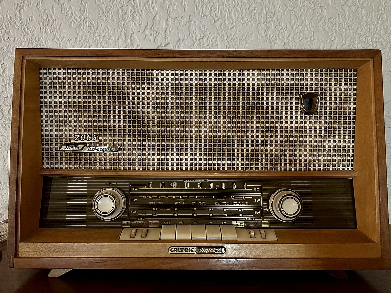 This is our current living room radio — we had an older console floor radio but we really didn’t have room for it. This one is from the 1950s. My husband learned how to repair tube radios so we have a few. Where it says “BC” that is what AM was referred to, and then this radio also has FM and short wave. It’s rather large for a tabletop radio, so I have it atop a china cabinet