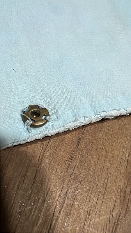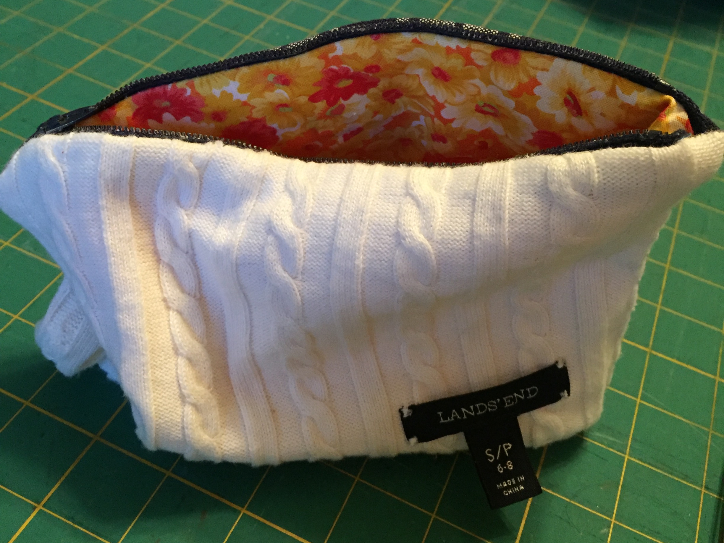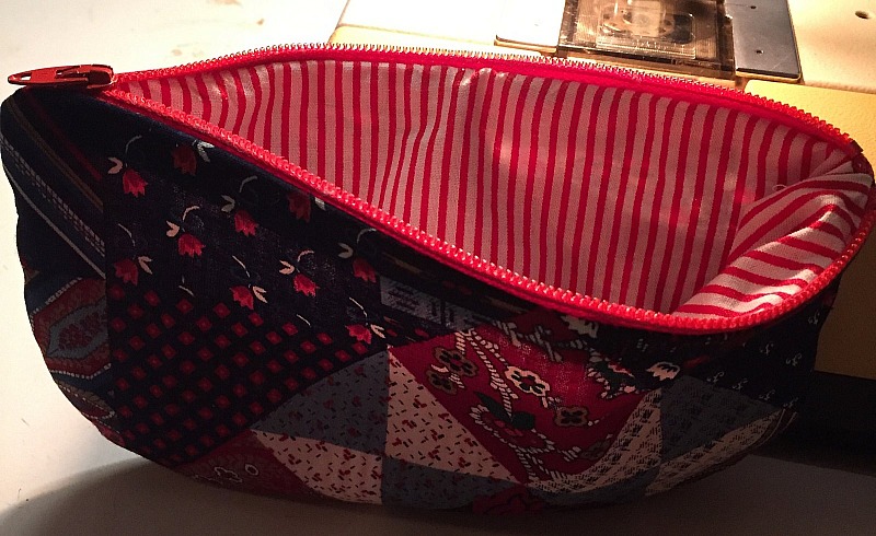 Years ago I asked my mother to make me a toiletry bag. She used clothes that I wore in the 1980s. A vest and a very ugly faux leather blouse for the lining. The buttons of the vest serve now to close the bag, the lining is good to keep the bag dry.