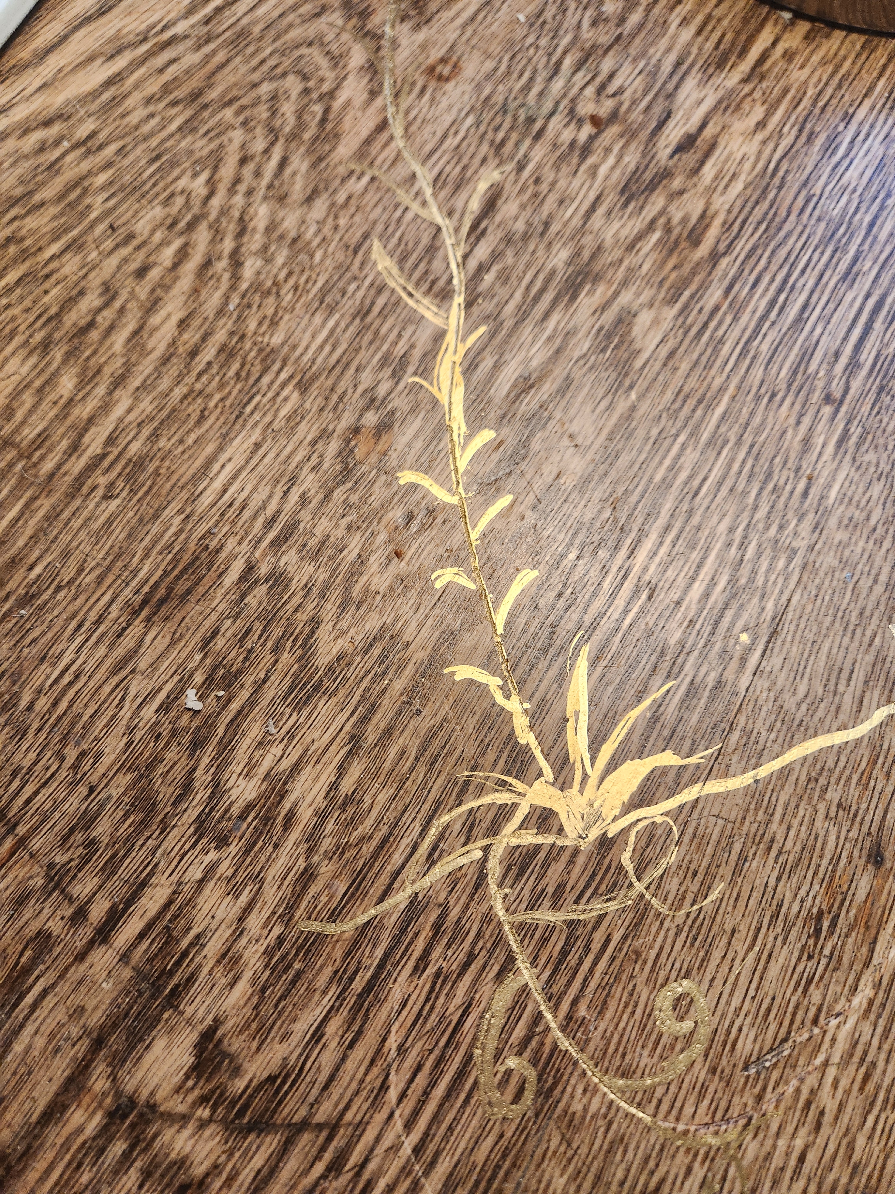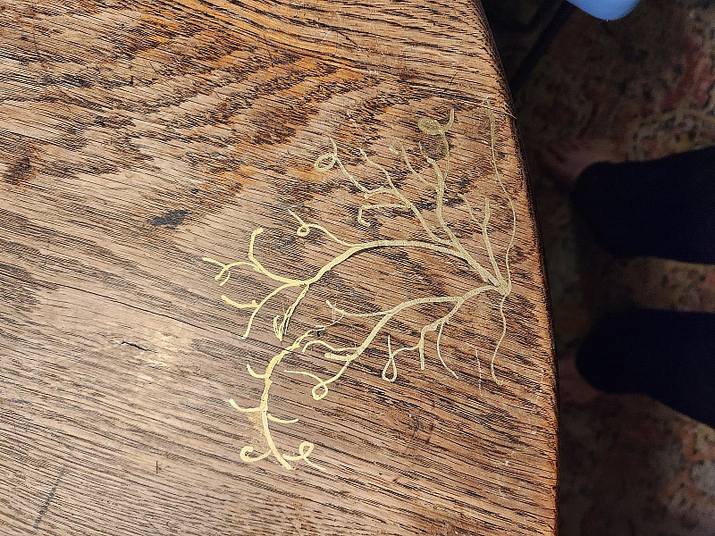 I have had a lovely 1920s or 30s table for maybe 30 years and have always loved it, not despite of the knife cut marks on it or the rings or whatever but because of them, because it showed the marks of life from so long ago. Last year, however, my son tried to stand on it to fix a light but it wasn't strong quite strong enough for that. I thought I was going to have to get rid of it but I had a friendly handyman here and he offered to fix it so he did by adding some bracing. Sturdier than ever now but unfortunately while he was drilling to secure the braces the drill must have slipped and moved across the table top leaving a rather deep gouge. I tried to accept it as just adding more character but it wasn't quite working.