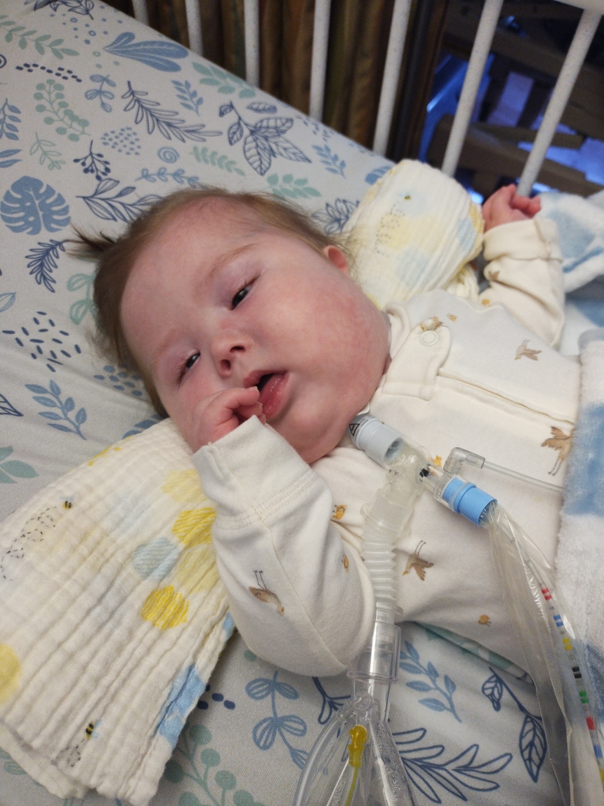 I wanted to update you on baby Jacob. We are still in the PCICU. He has been taken off of the Bipap machine and put onto a CPAP machine. The infection he got weeks ago that was in his lungs has done some damage that's going to take a long time to heal from. He also fought sepsis a couple weeks ago from the same infection that got into his blood. He is doing better now though. Yesterday we had a big meeting for him and we all agreed that despite our best efforts Jacob is not going to recover his respiratory function fully in the immediate future. In the interest of getting him home and out of a hospital bed with tubes strapped to his face 24/7 we have decided it's time to get him a tracheostomy. This is a good thing and a bad thing.