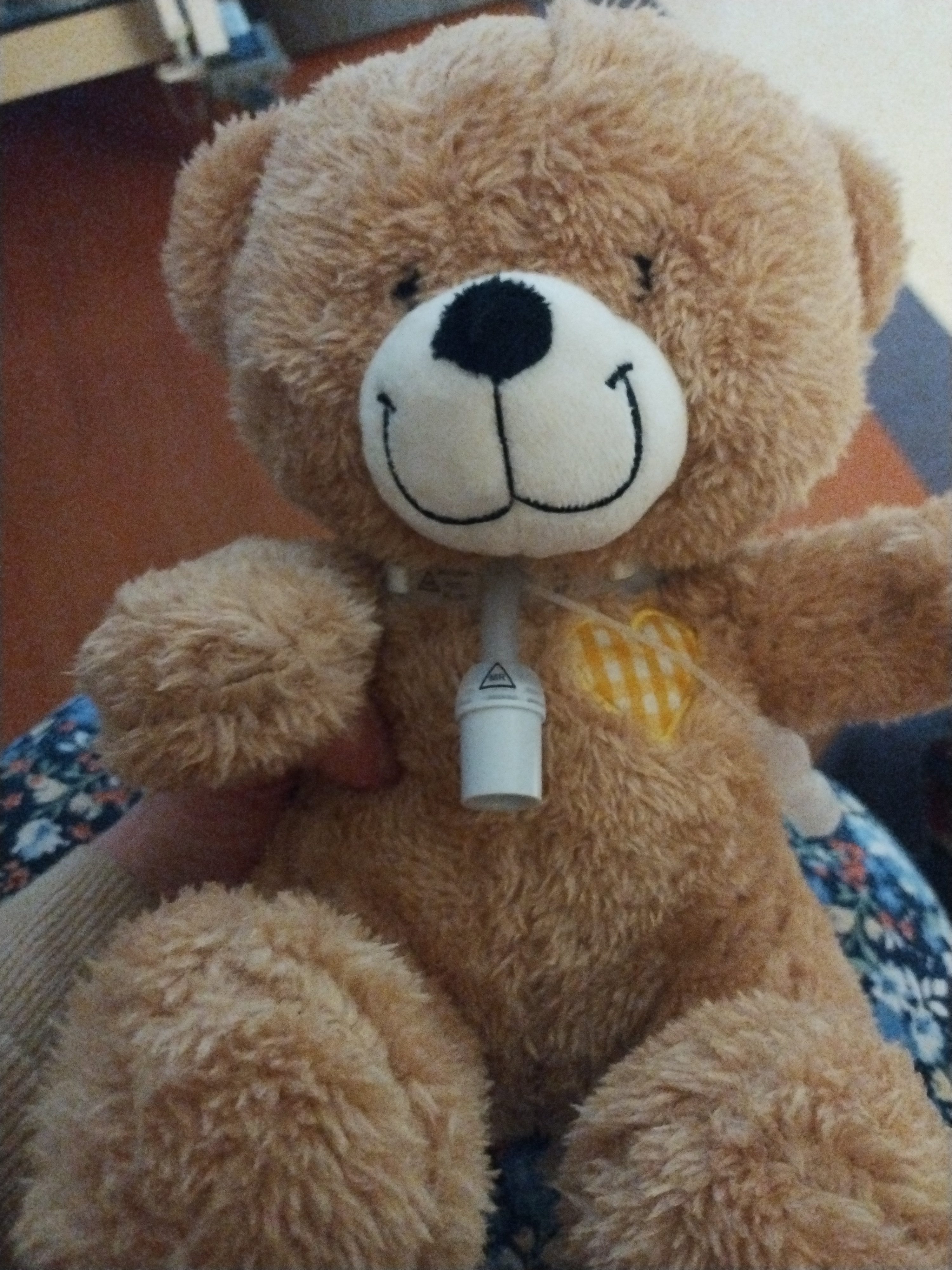 Today, after church, my husband and I are going to make the 1.5 hour drive back to Baltimore to see Jacob and for my husband to get his first training session with the respiratory therapist. He has decided to rip this off like a bandaid and instead of starting small he is jumping into the most daunting and new wrecking task that trach families must face...our first trach change. He must take the trach out and put the new one in. This action takes all of ten seconds but it's a huge step in our lives as parents in transitioning to a trach baby family. If you can do that part of the care, you can do any part of the babies care. I am excited to have this done and over with. I have personally taken the trach out and replaced it more than once. The first time for me was unsettling. The second time was easier and I am sure it will get easier and easier as time goes by. The respiratory therapist at the pediatric hospital gave us a stuff bear with a trach so my husband can see the trach and how it works before we even go in for his first training.