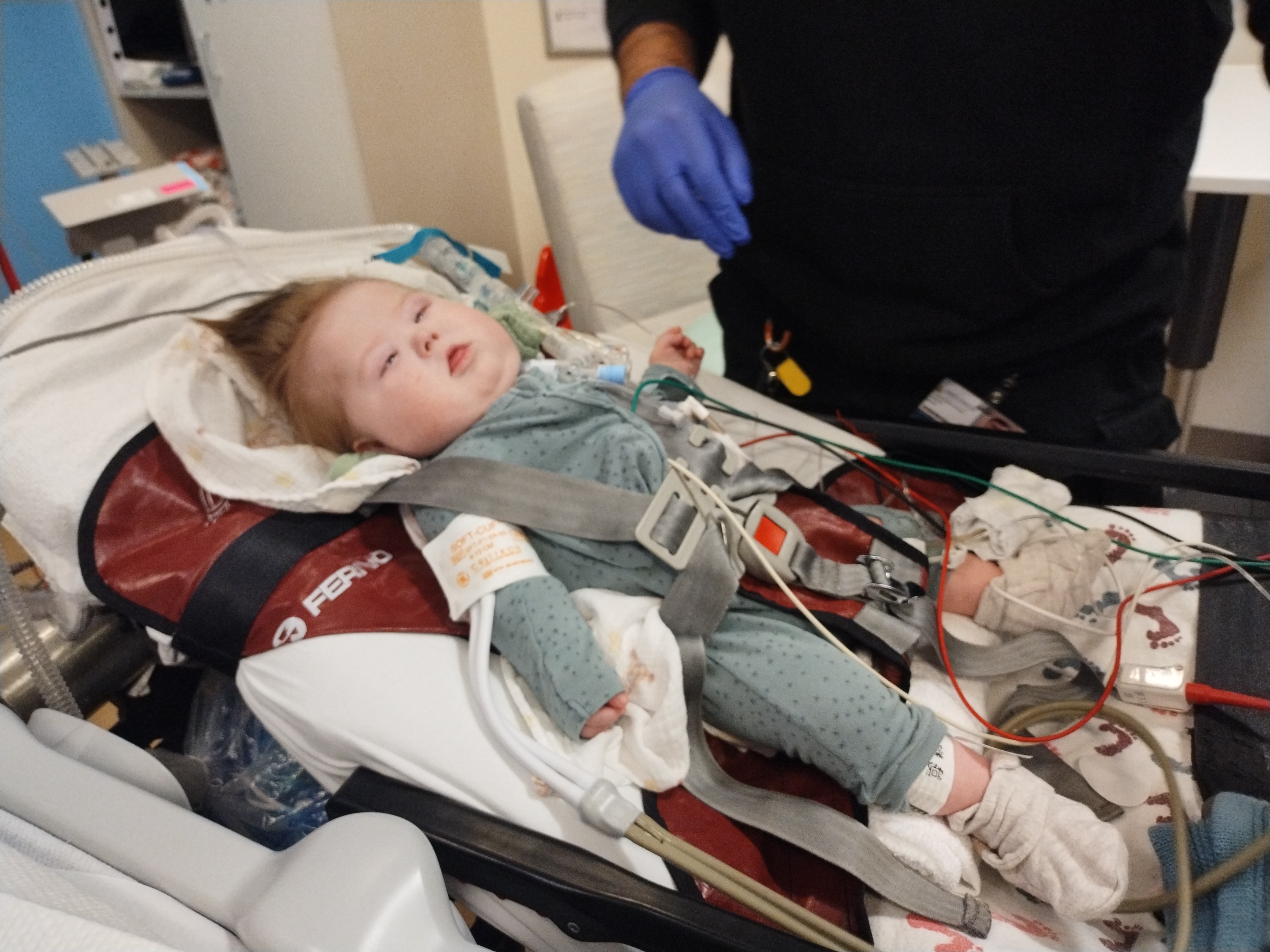 I will end by adding a picture of two if I am able. The first picture is Jacob getting ready to be transported to the new hospital. The second is him settled in, and the third is the training Teddy bear. God bless and thanks again for the caring thoughts and prayers for Jacob.