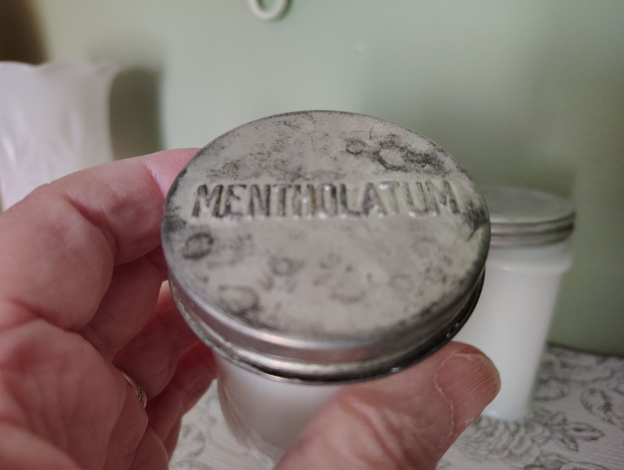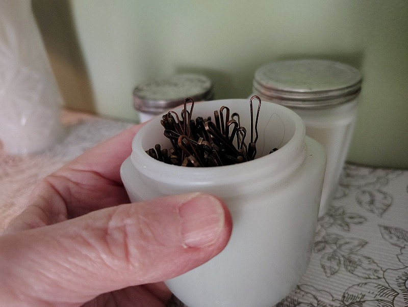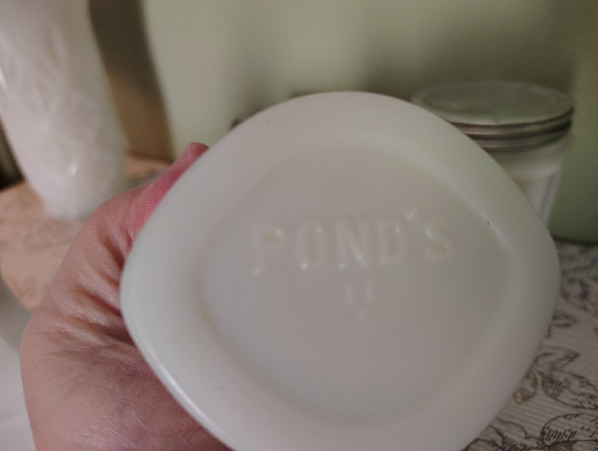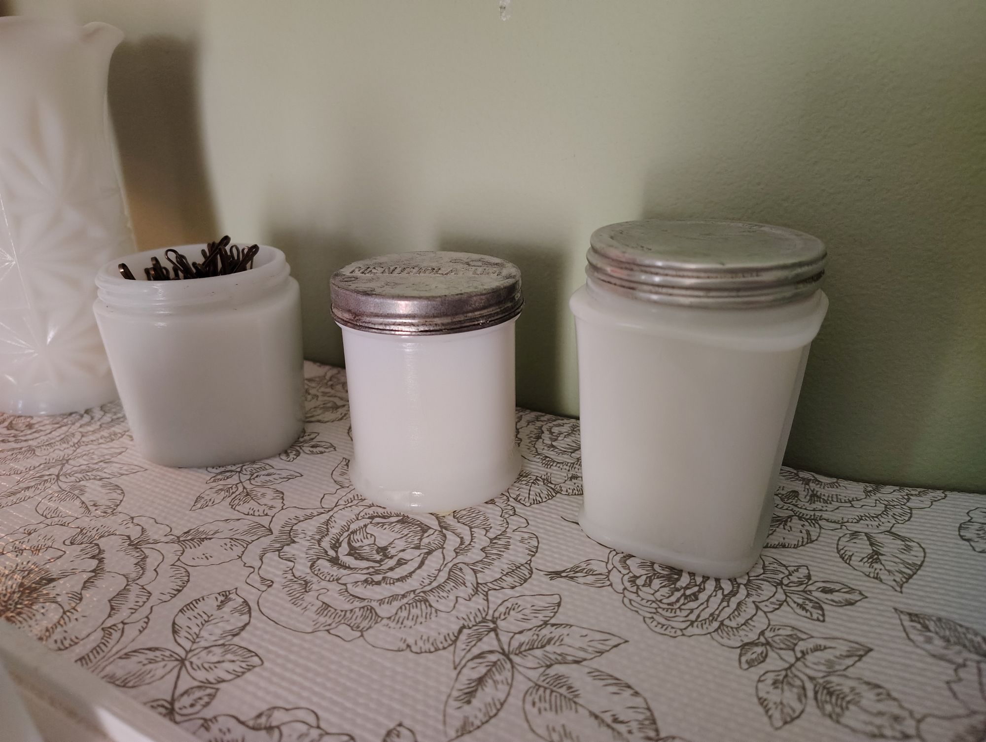 Rose M, yes, mine are all white milk glass. The photo of the three lined up are from left to right, ponds cold cream, I do not have a lid for that one, a very old milk glass mentholatum jar and I transfer our vicks from the plastic jar to the vintage milk glass jar. The lid says MENTHOLATUM. The one on the right is a vintage milk glass French cold cream jar. Today when I looked on ebay to see if they had some ponds jars and found they did have several, I purchased one with a lid so now I will put some body lotion in the French lotion jar and move the ponds to the new vintage milk glass ponds jar with a lid and continue to keep my bobbie pins in the one with no lid. :) I like removing the contents from plastic to milk glass. Just feels right. :) I have another apothecary milk glass jar I use for tylenol. It is a narrow taller jar.
