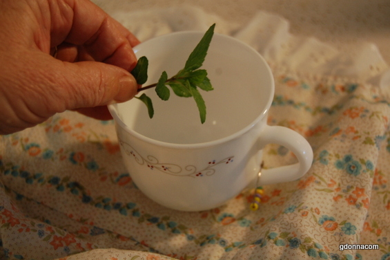 Now for something simple. Sometimes we forget how simple it is to make a simple tea. This above is a sprig of peppermint I picked in the garden. The spots are on my camera lense, I do wish I knew how to get them off. It is on the inside and if anyone knows how please email me.