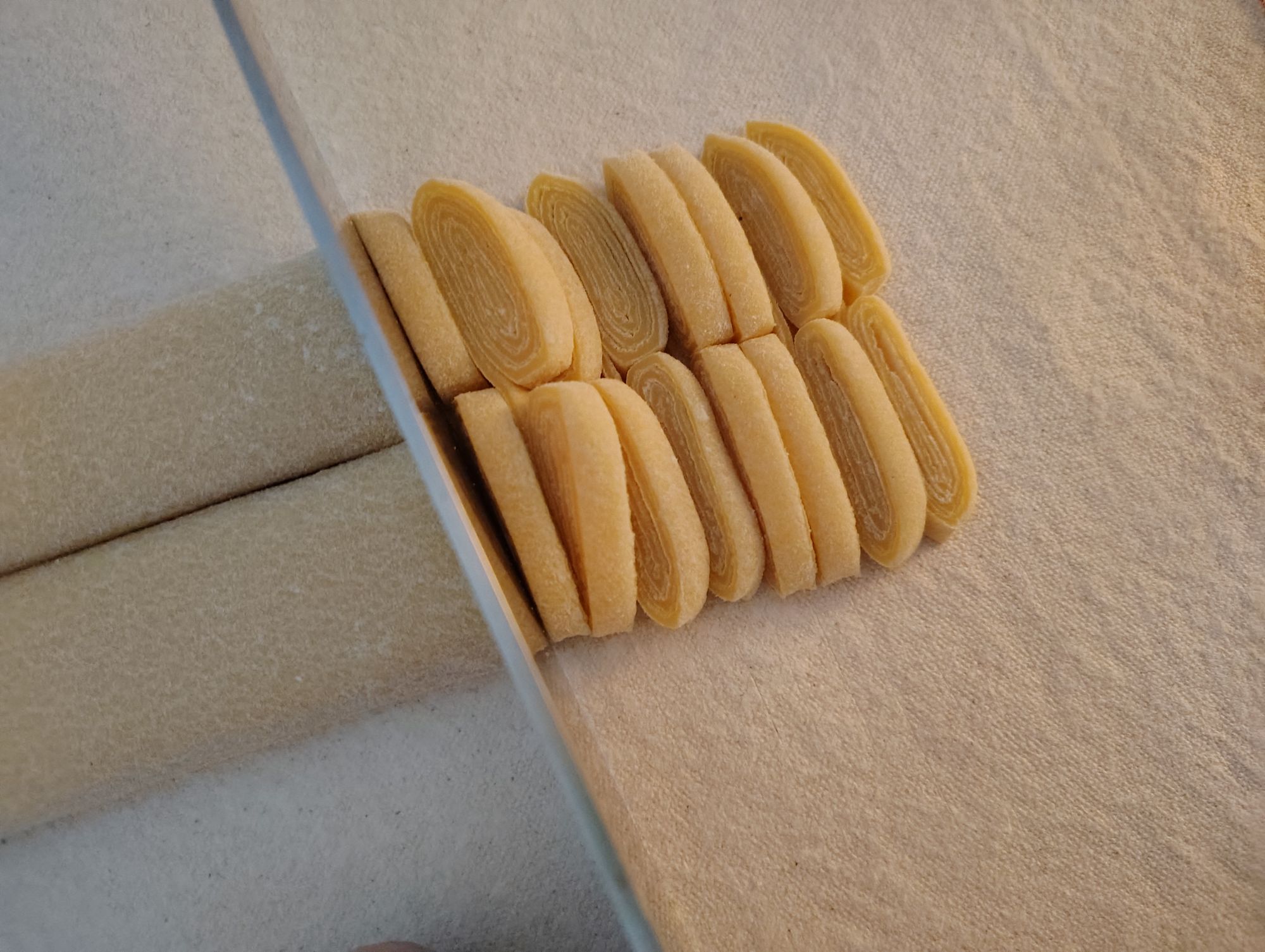Cut it the size you want your pasta.  The right side is where I cut it, the knife there in the middle and the rolled dough on the left.