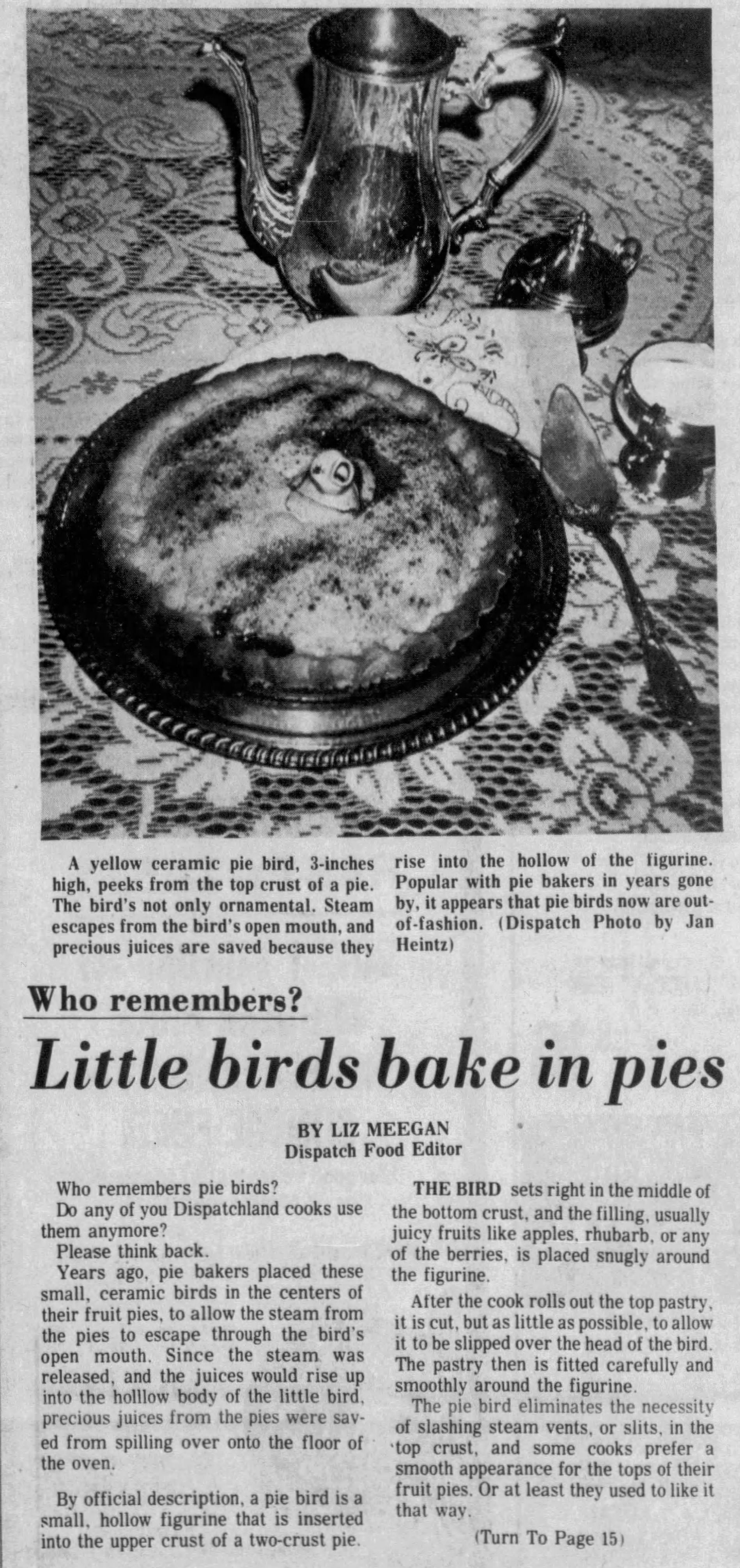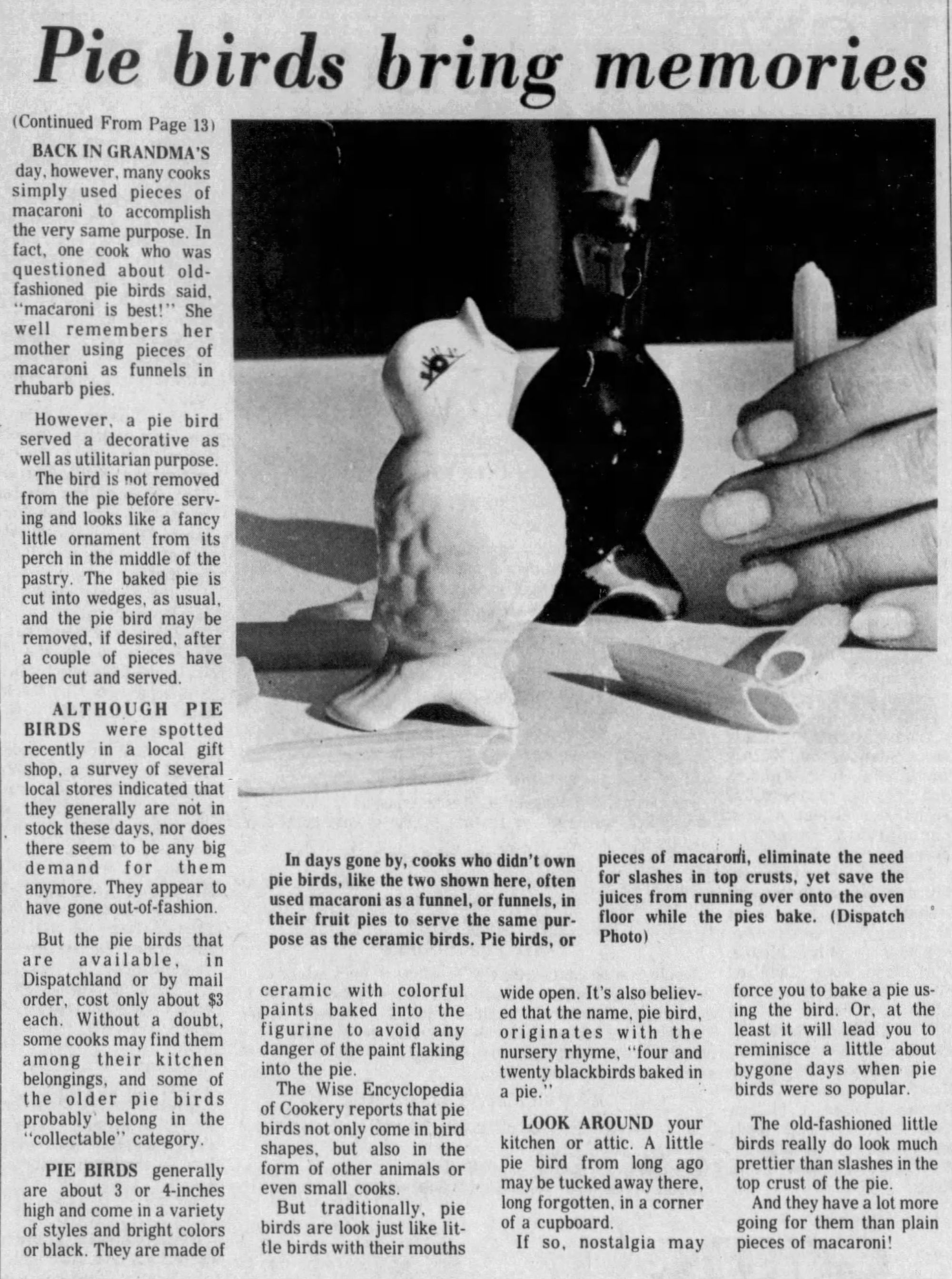 I read an article that said that Pie Birds were used during the Victorian era.  I could not find an article during that time.  But what I did learn is that the Pie Birds have come in and out of popularity.  In 1977 they were discussed in this article above.
