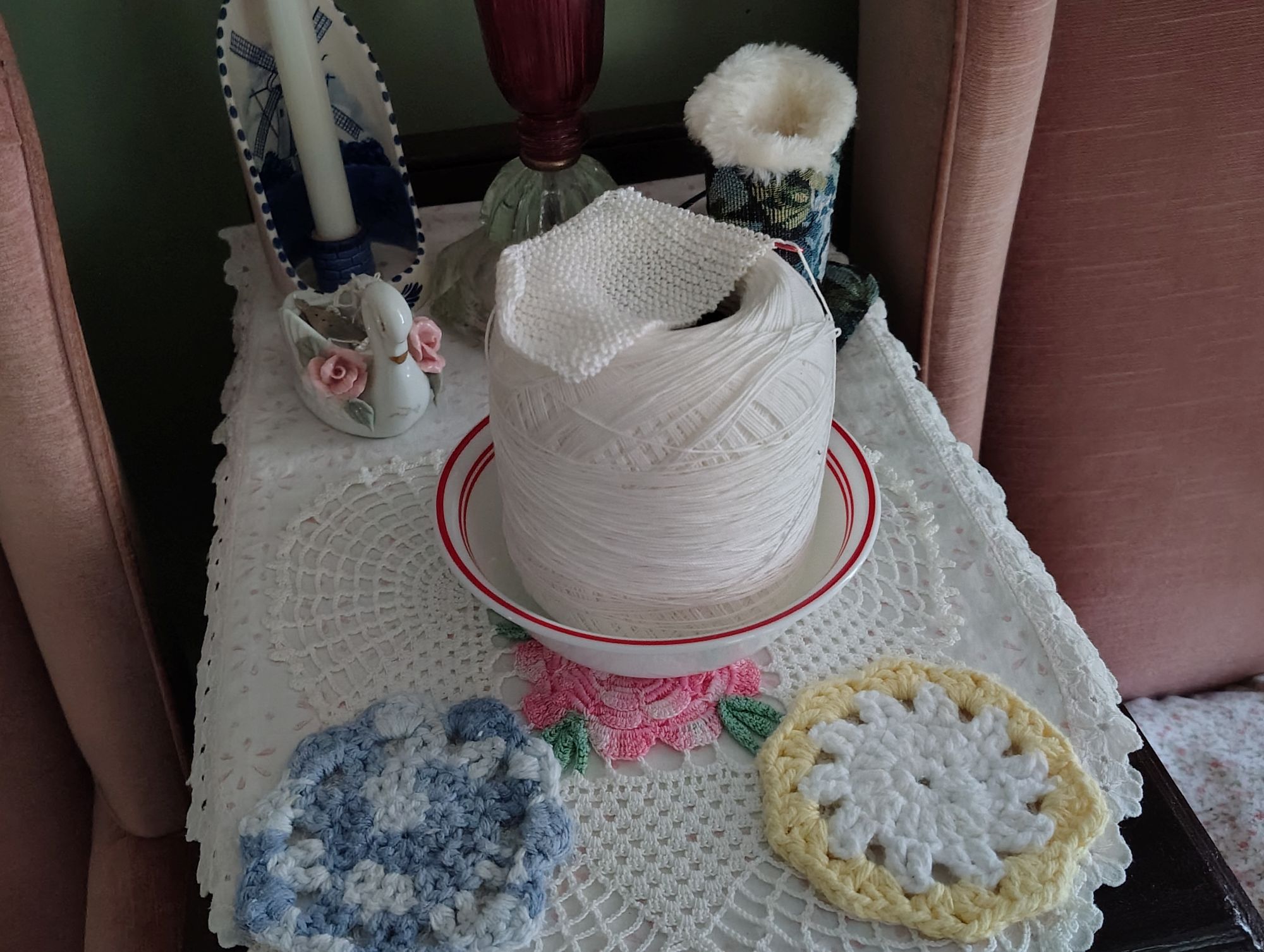 I keep putting my roll of cotton thread and knitted bandage by my chairs thinking that I really am going to knit some more on this piece.  It is rolled gauze that I am knitting like they made during ww2 but I am not getting very far with my roll.