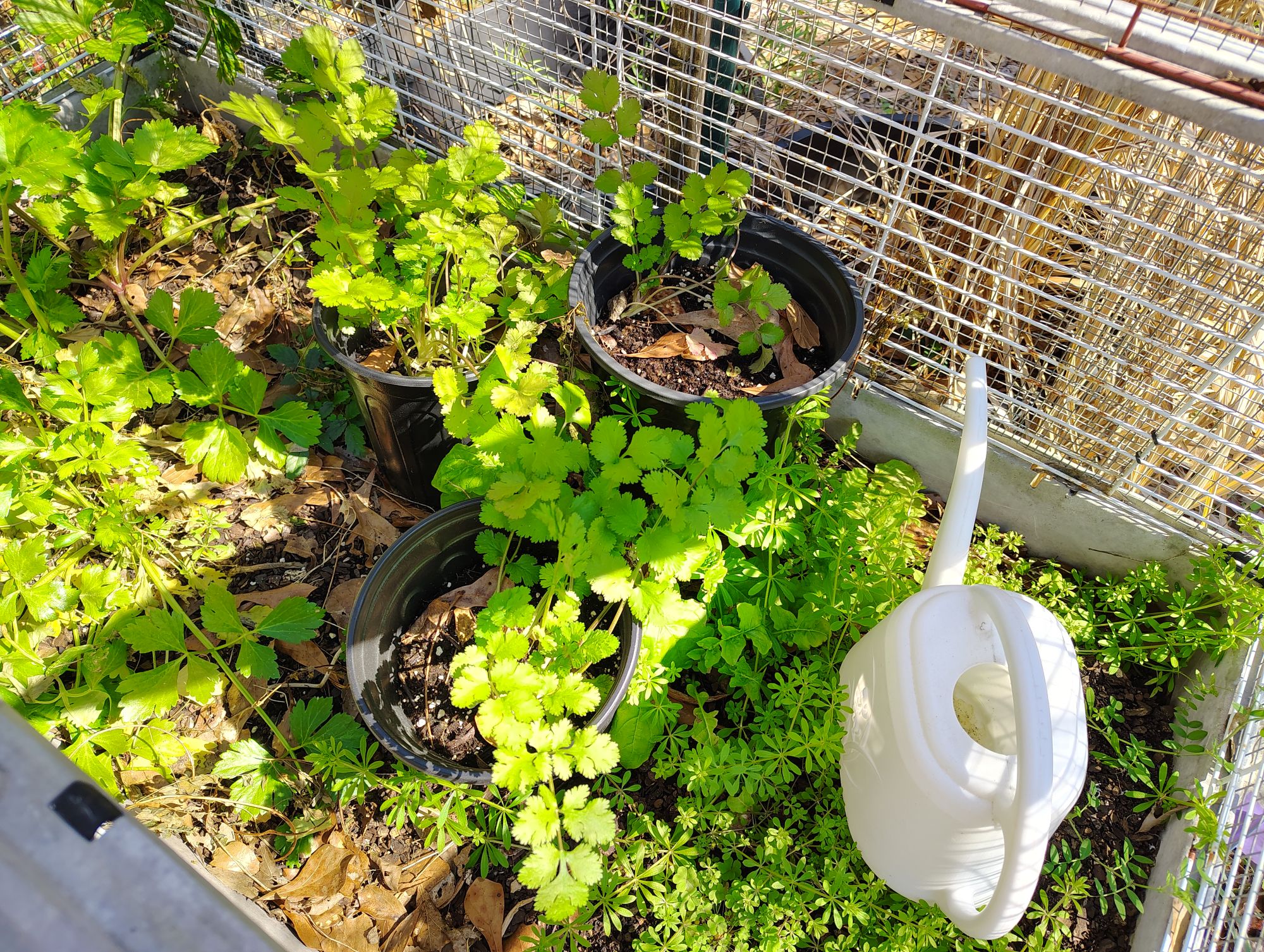 Cilantro loves the cold weather. The cilantro is in pots sitting in a cage and those are weeds growing around the pots.