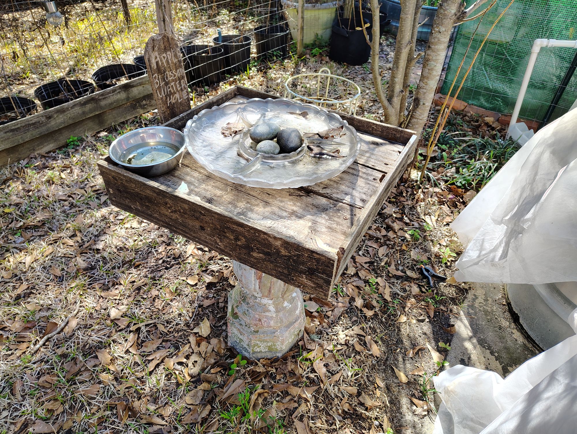 A raccoon knocked the top of our cement bird bath off the pedestal so Charles built a rustic top so we could set out dishes to hold water. The glass serving dish has been used as a bird bath for the past twenty years. It was on top of a wooden post with a wooden top for the glass dish to sit. Charles replaced the top many times and then the post rotted. It has been through all kinds of weather throughout all of these years. It was never used for it's intended dinning table use for olives, celery and carrot sticks with dip in the center. It has served the birds and wildlife all of these years a nice place to drink water or bathe.