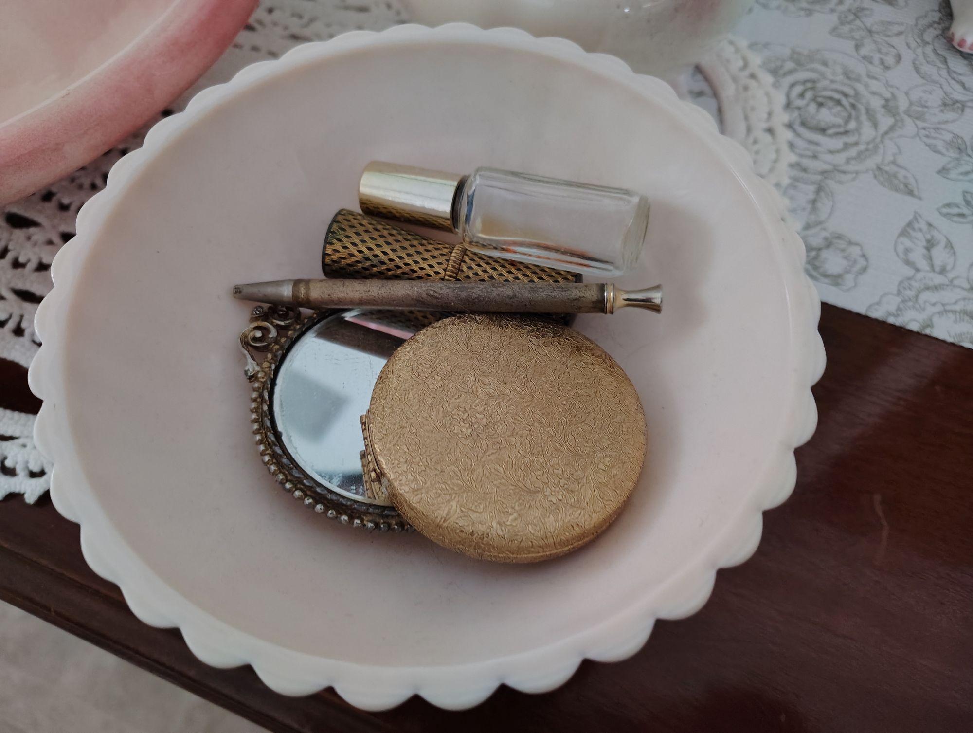 My daughter found a lovely small pitcher and basin while thrifting and brought it to me when she came up for the visit. I am using it for morning wash up as a face bowl. It is very handy and feels a bit DejaVu or somehow like it is supposed to be.