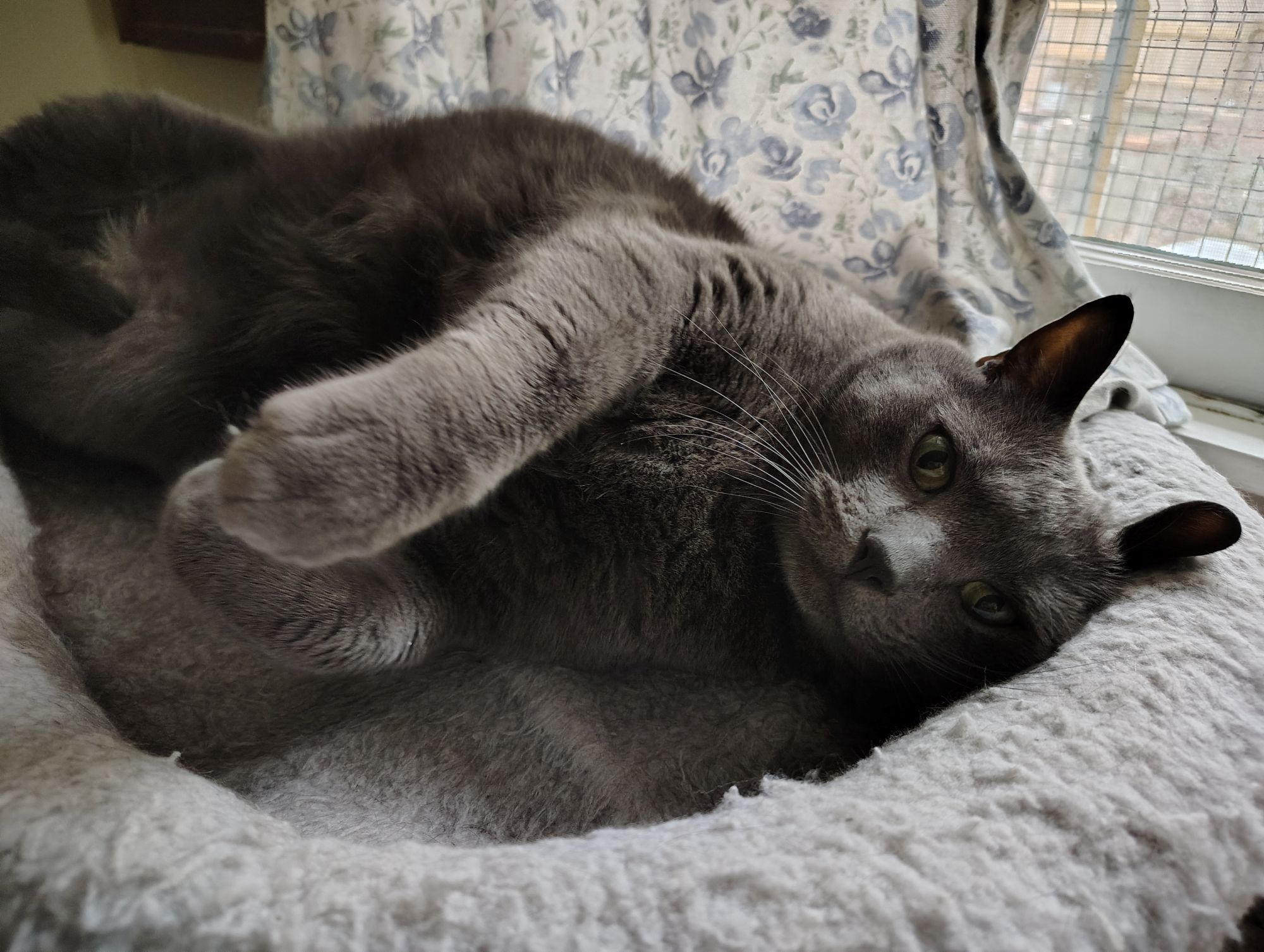 When Charles mother passed away, we became new parents to her cats. Jess is very comfortable here. This was taken today and he was making muffins on the ring of his bed and purring. They have lived with us over two years now.