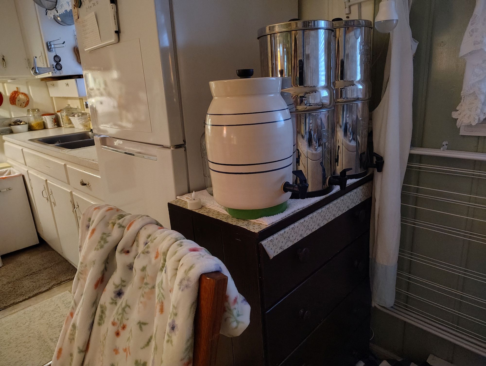 We put up some hooks to hang one of the laundry racks next to the water filters. It is good to find a place for this laundry rack to live. We have another that has a place to live in the master (guest) bedroom.