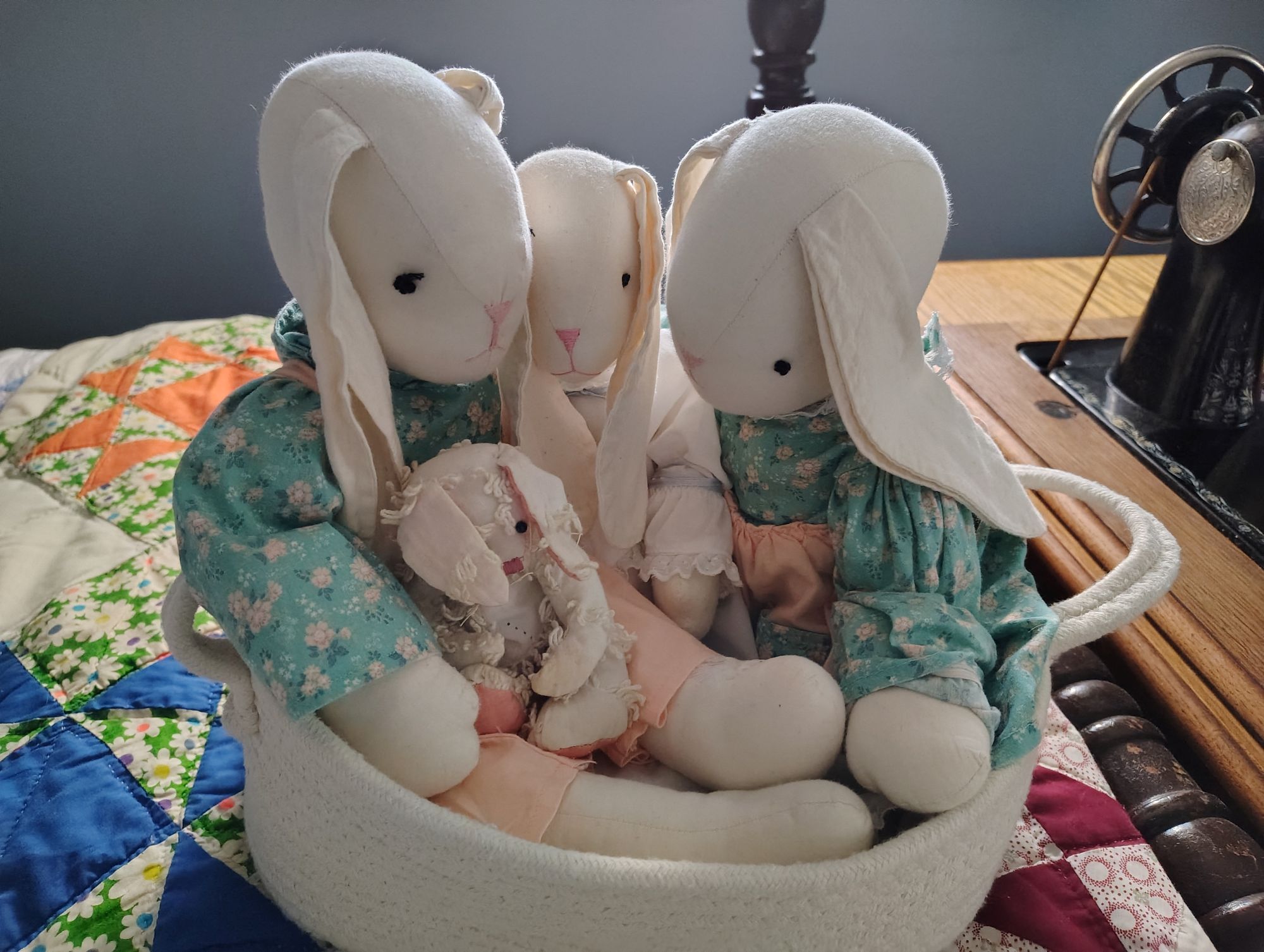 You can tell the bunnies are worried, they wonder if they are going to move again. Actually I have decided to give them their own shelf in this bedroom so that they can stretch out a bit. I do not consider them clutter, they are part of the family so they can stay.