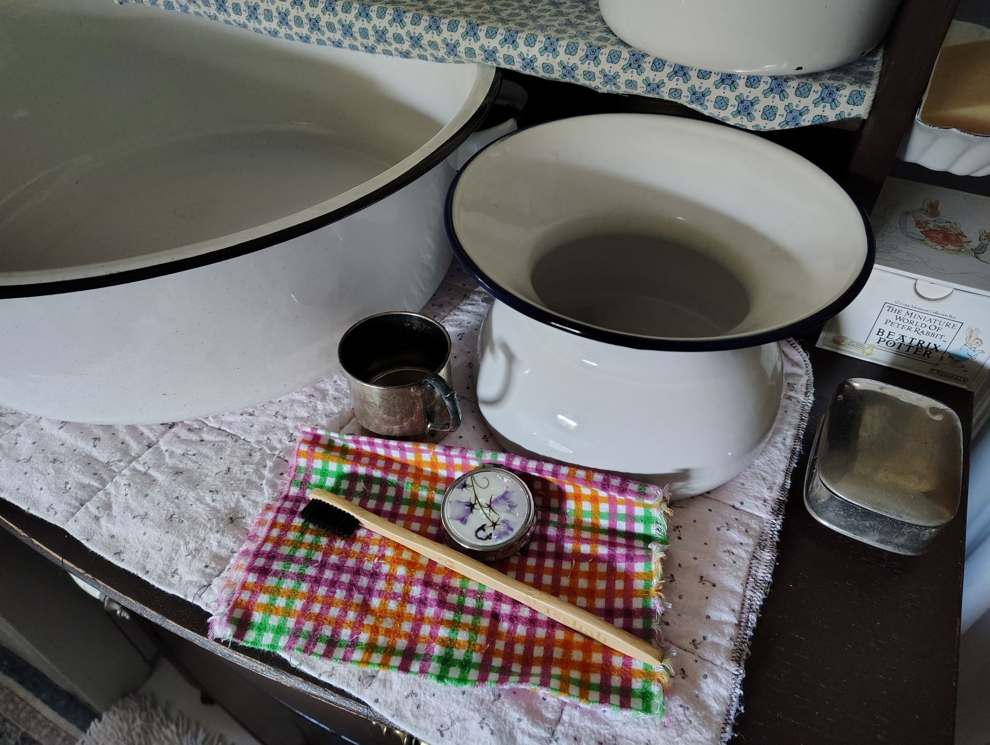 For our conservation of water I am using the washstand for bathing and grooming as they did long ago before running water. I am actually getting much better at this and enjoy the routine.