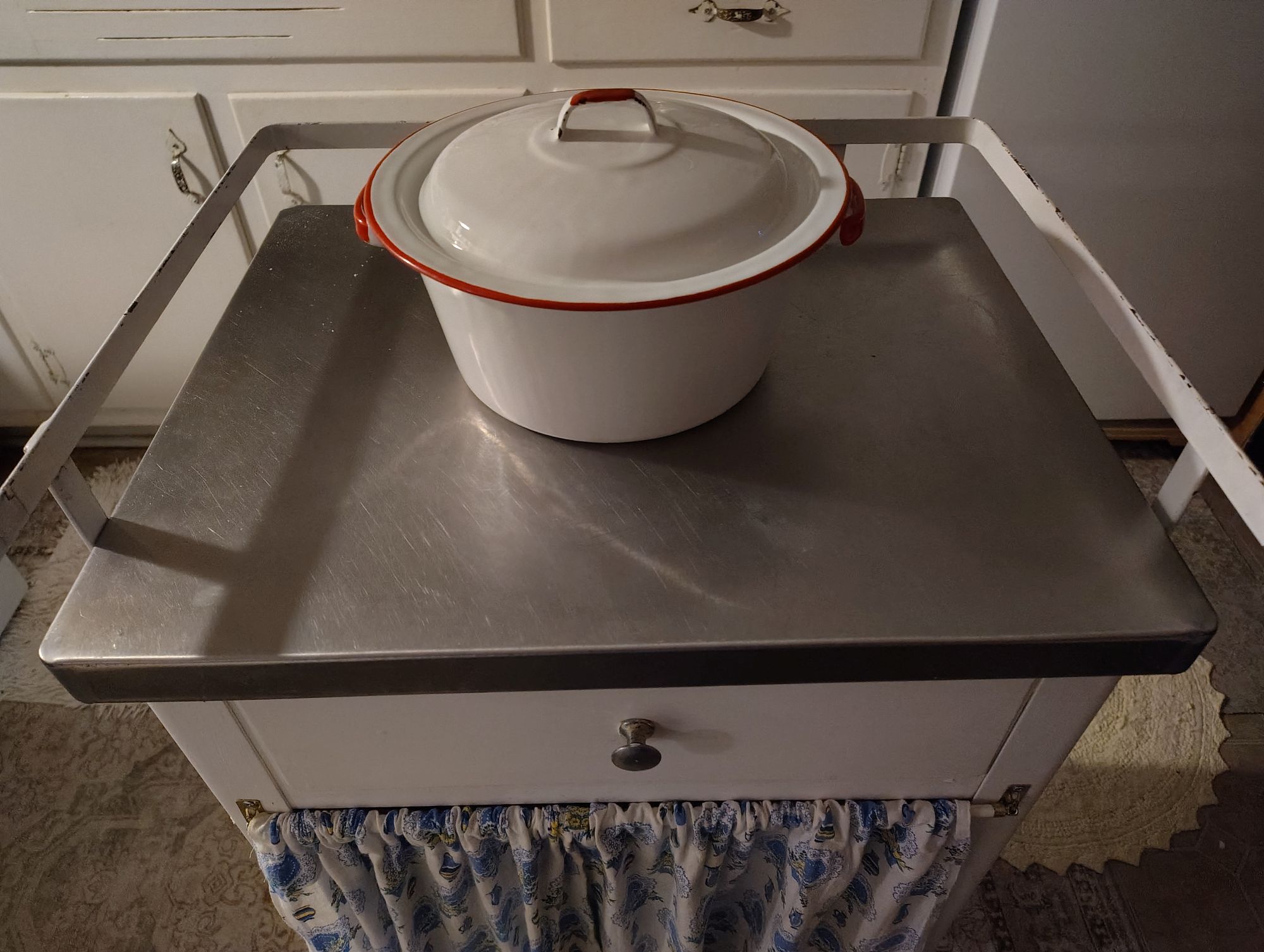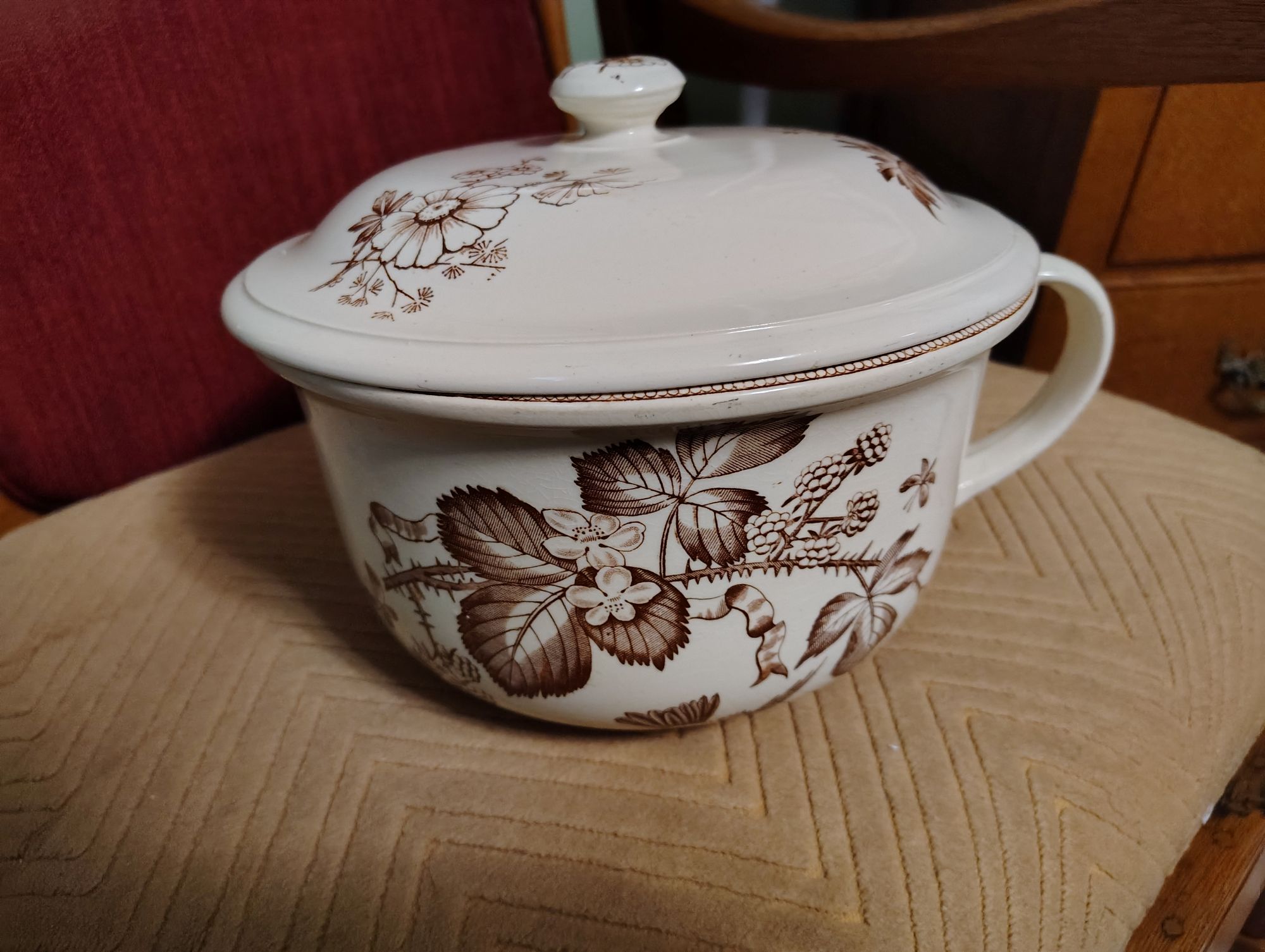 The chamber pot can be ceramic, porcelain or and enamel pot with lid short enough to slide under the bed to use for urination during the night.