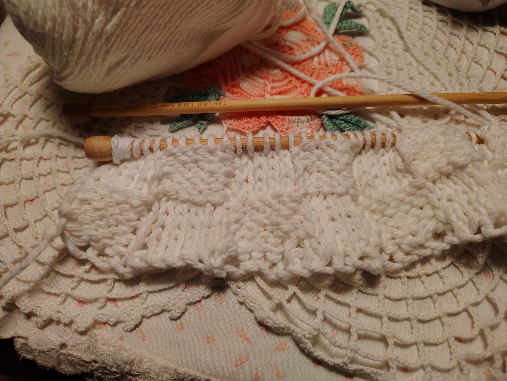 The instructions for the Knit and Purl cloth: cast on 40, knit five, purl five, to the end, the last one will be knit. knit five rows.