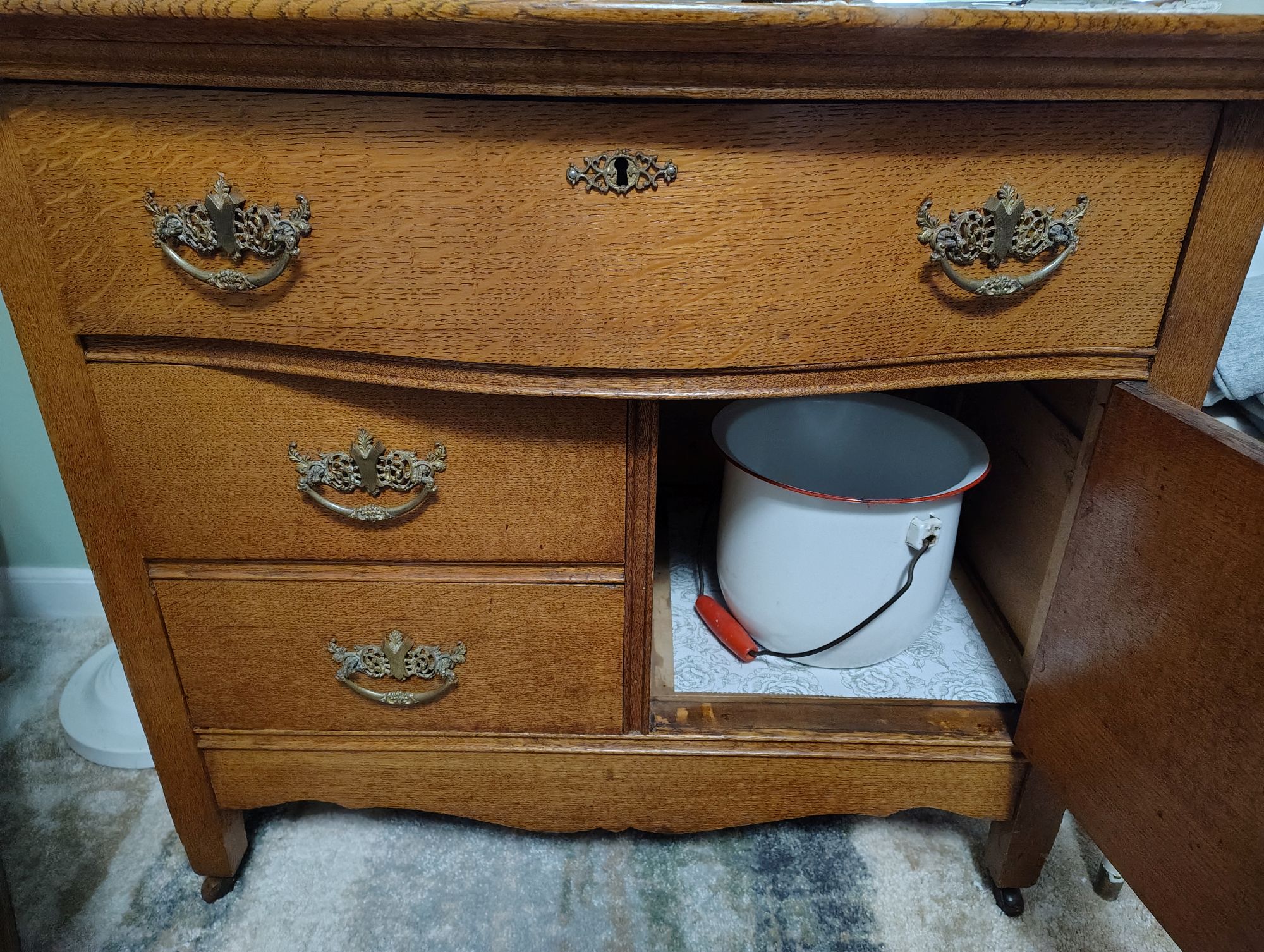 Many of the antique washbowl cabinets have a place to hold the slop pot or chamber pot. The slop pot is for carrying out the used water from the washbowl.