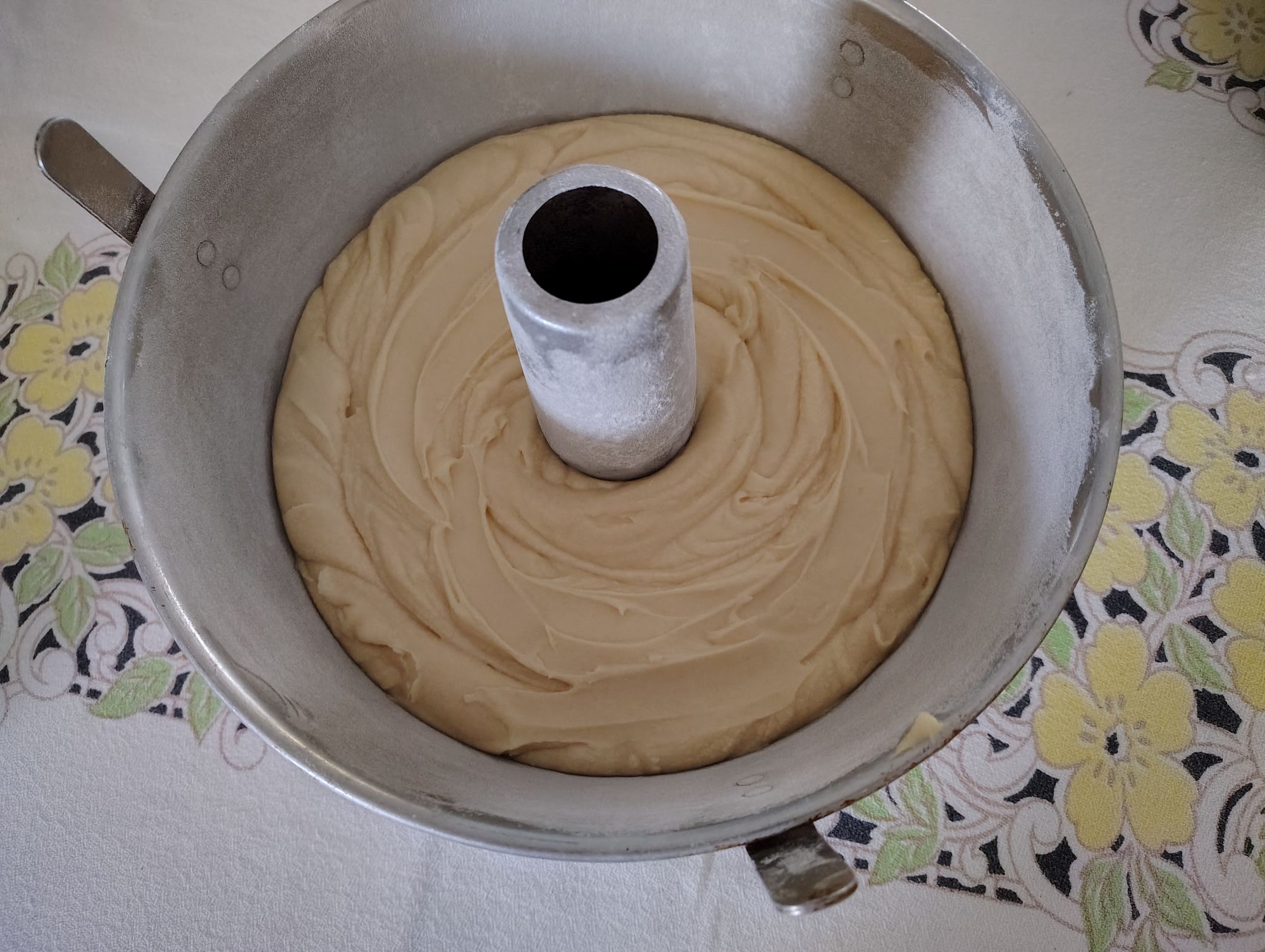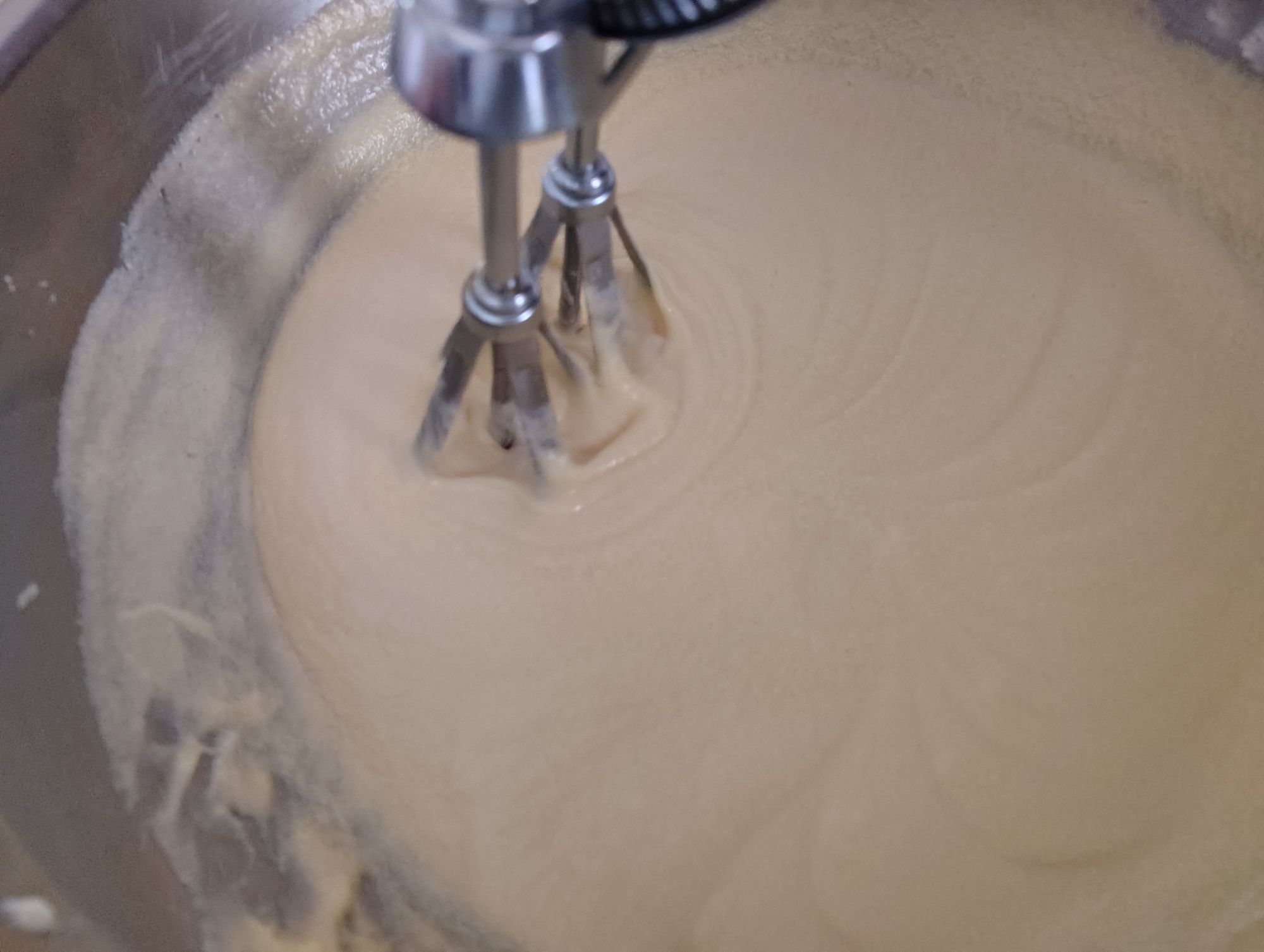 A pound cake has a thicker batter but it looked very similar to what my electric mixer does. Photo above it is ready to go into the oven.
