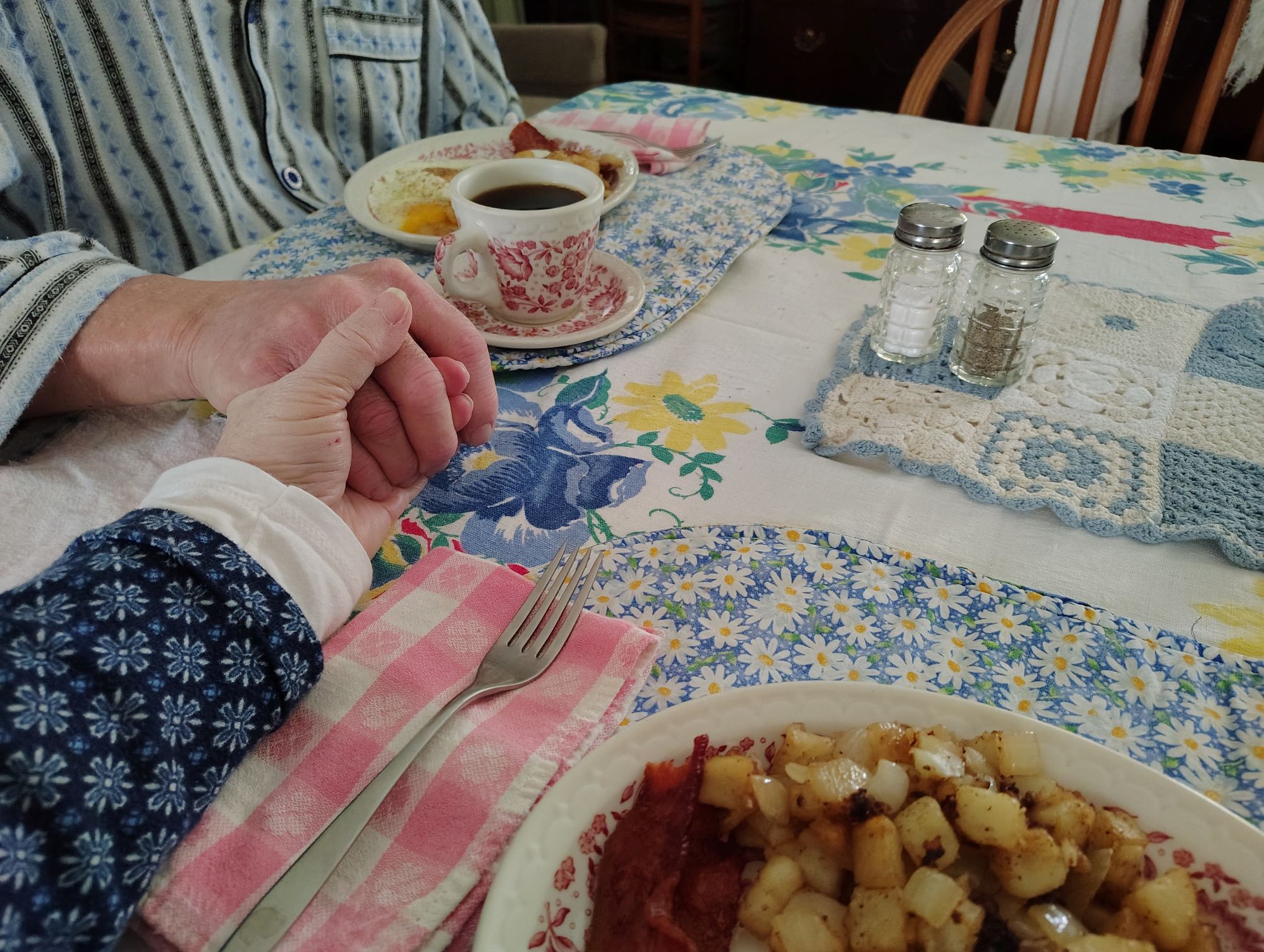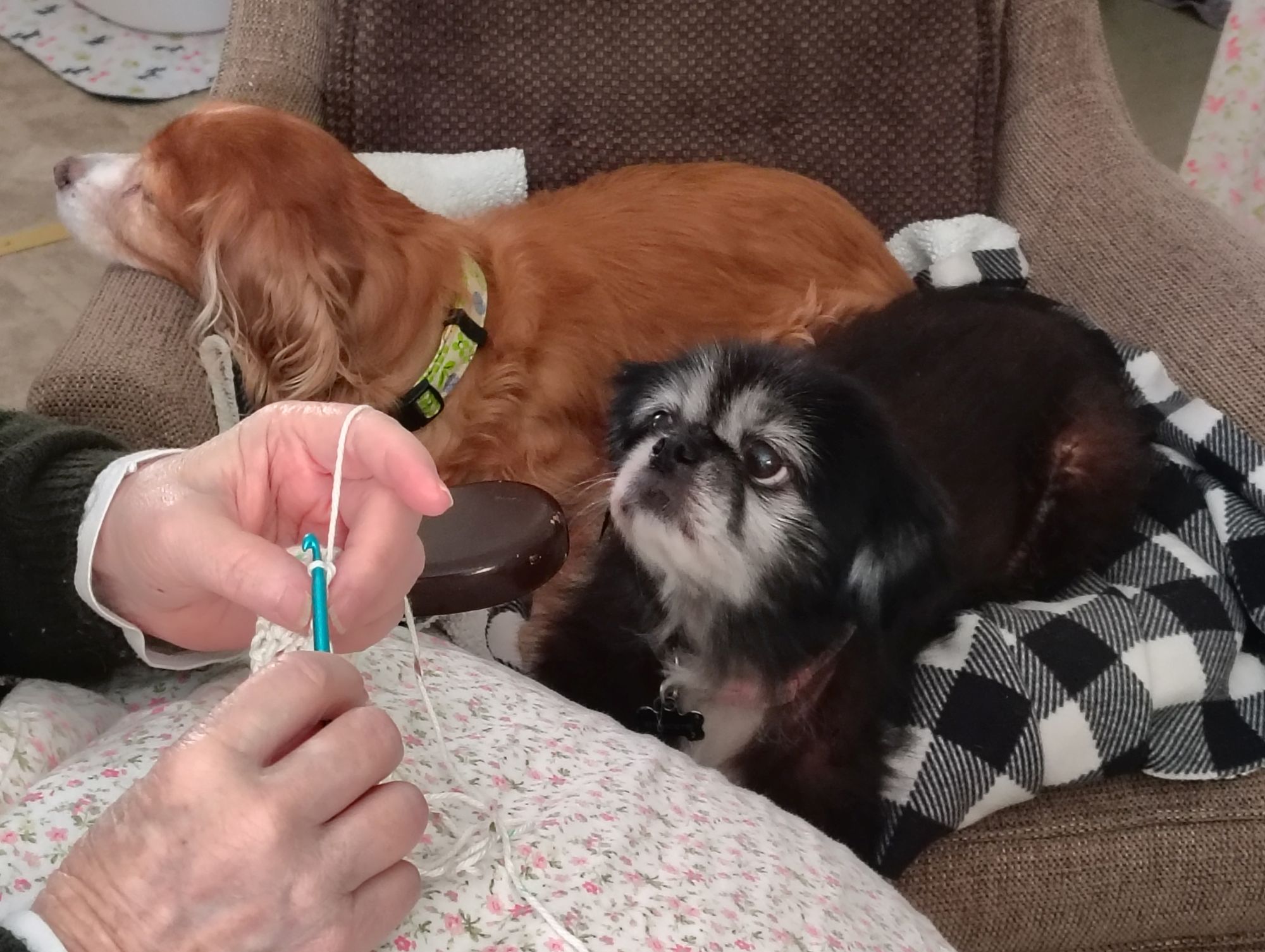 Bernadette is listening to me telling her about my crochet bathcloths for Baby Jude.